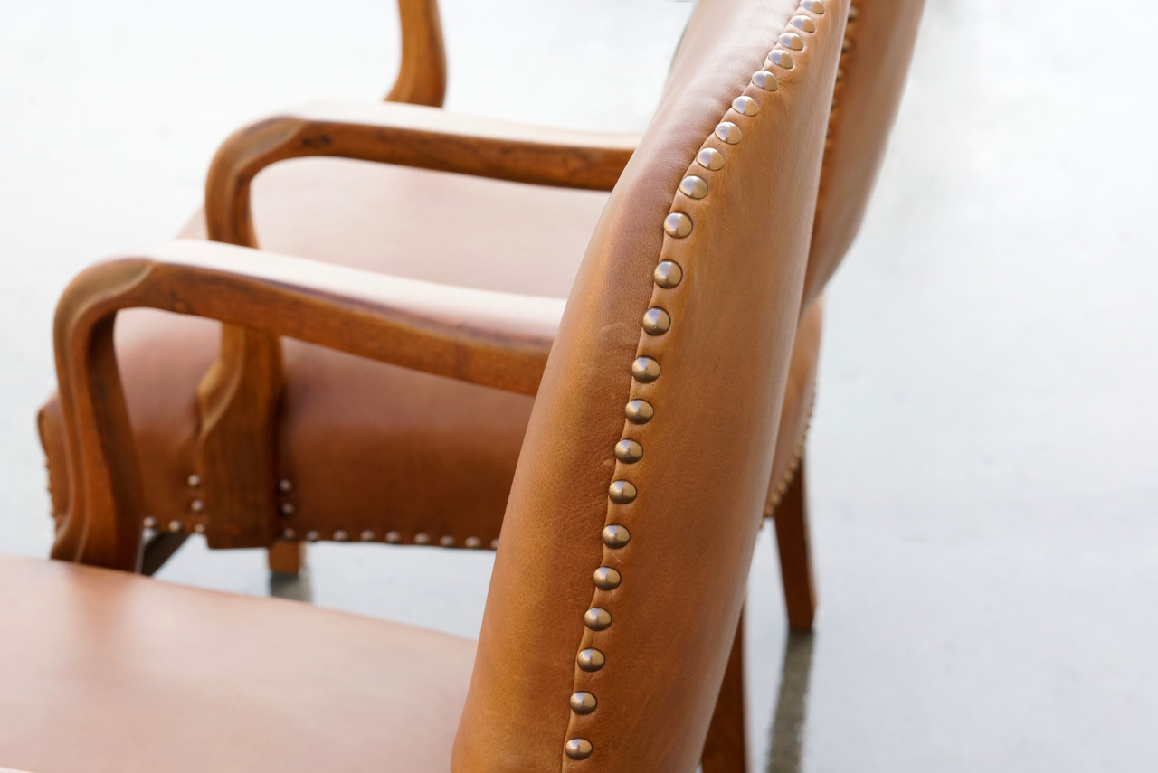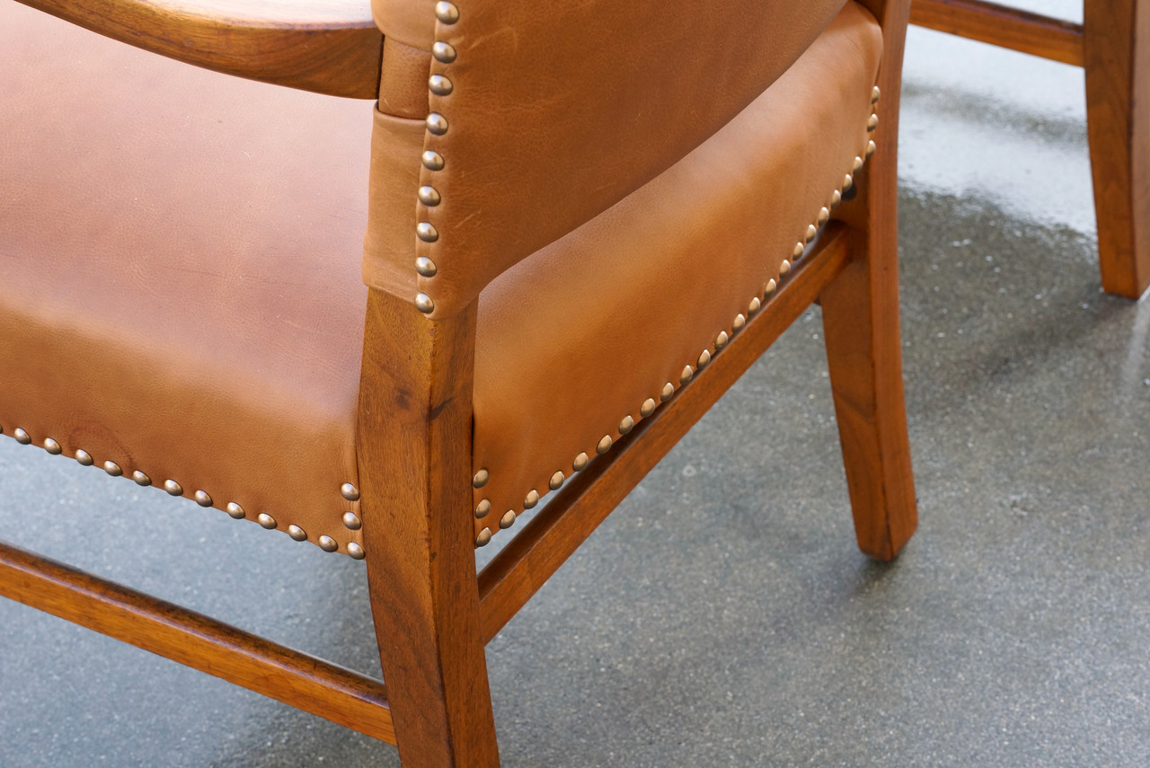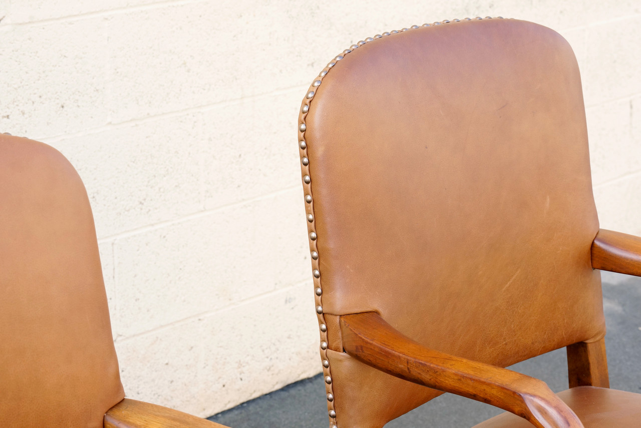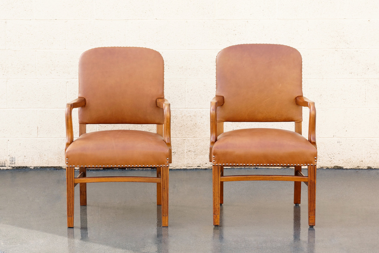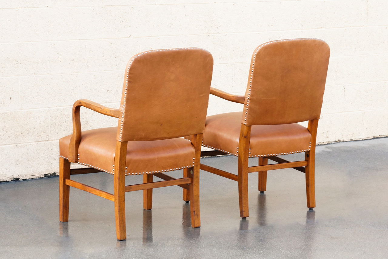 Stately pair of Gunlocke armchairs from 1948. Refinished oak and reupholstered in camel-colored leather with hammered upholstery tacks. Oak arms feature subtle carved detailing along the curves. Please note: foot risers have been replaced, not pictured.