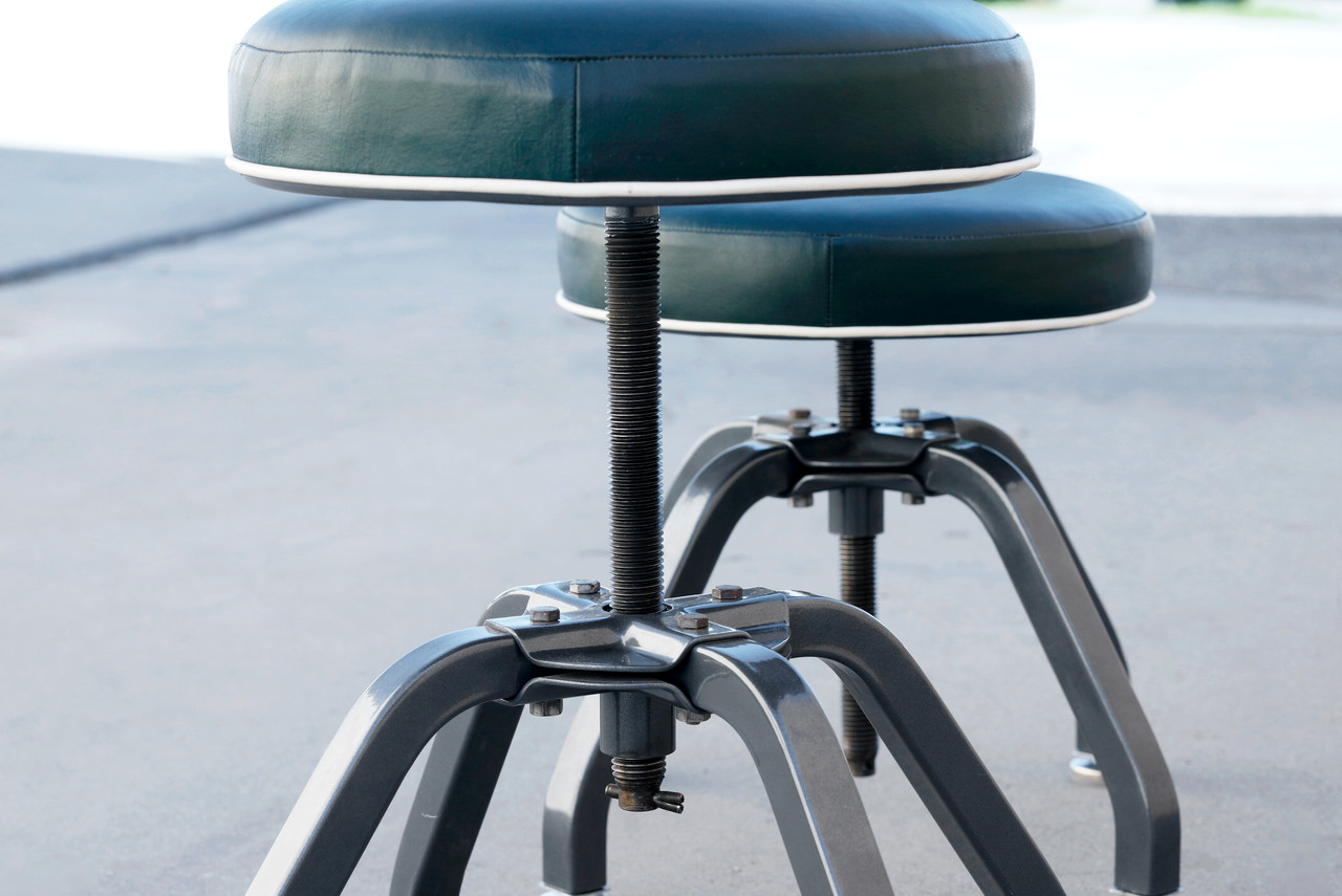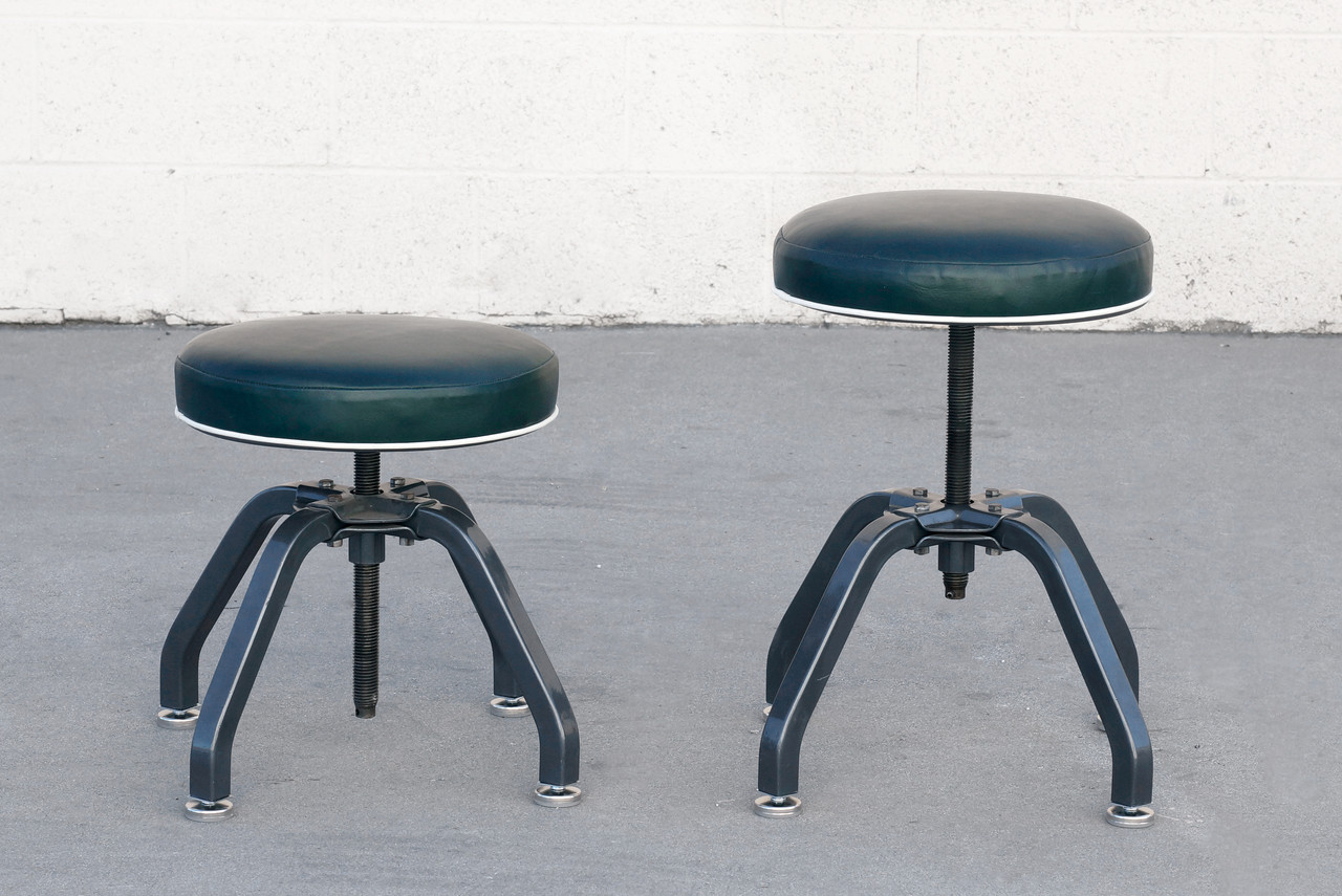 Very rare pair of vintage chrome salon stools from Buty-Crafters. These were rescued from a 70 yr old beauty supply manufacturing facility in Los Angeles. Freshly powder coated bases in dark metallic grey. Reupholstered in recycled dark green leather.