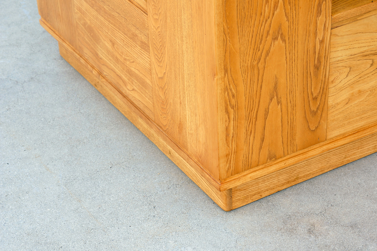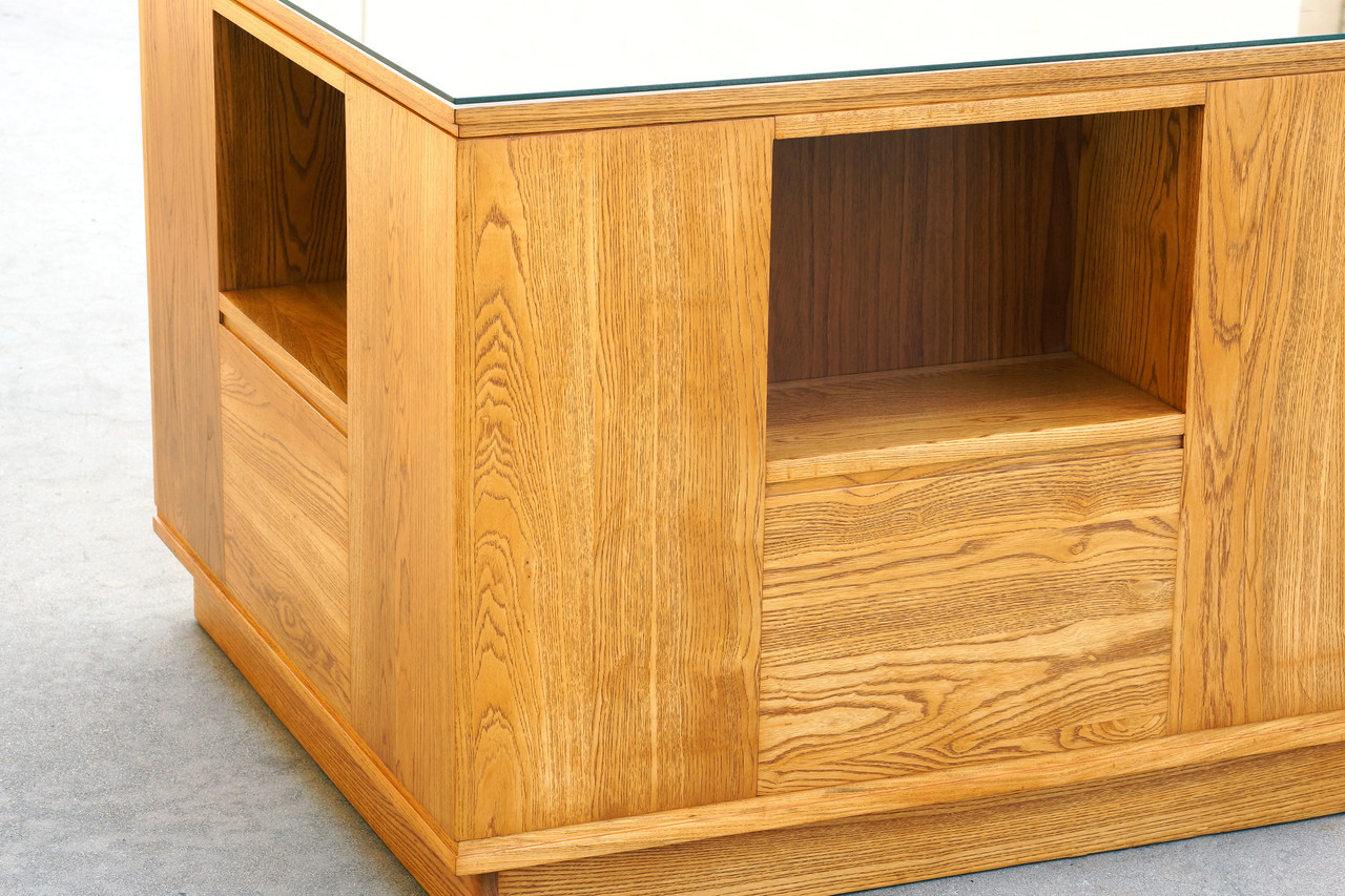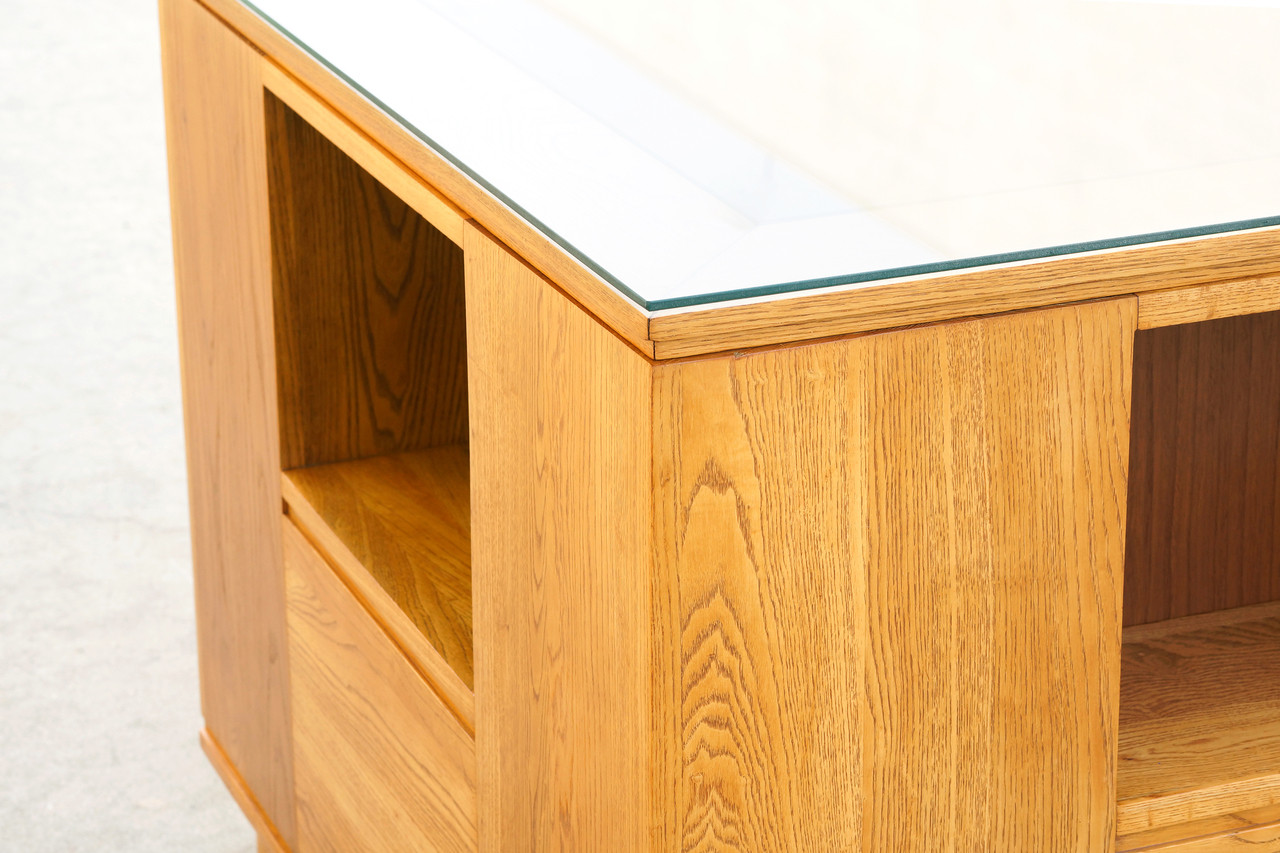 Absolutely wonderful modernist entryway table custom designed by Paul Frankl for a private Los Angeles residence, c. 1940s. Constructed of solid oak with a built-in display alcove on each face. Inset base elevates the cube off the ground. Fantastic wood grain pattern. New glass top. Rare and unusual.