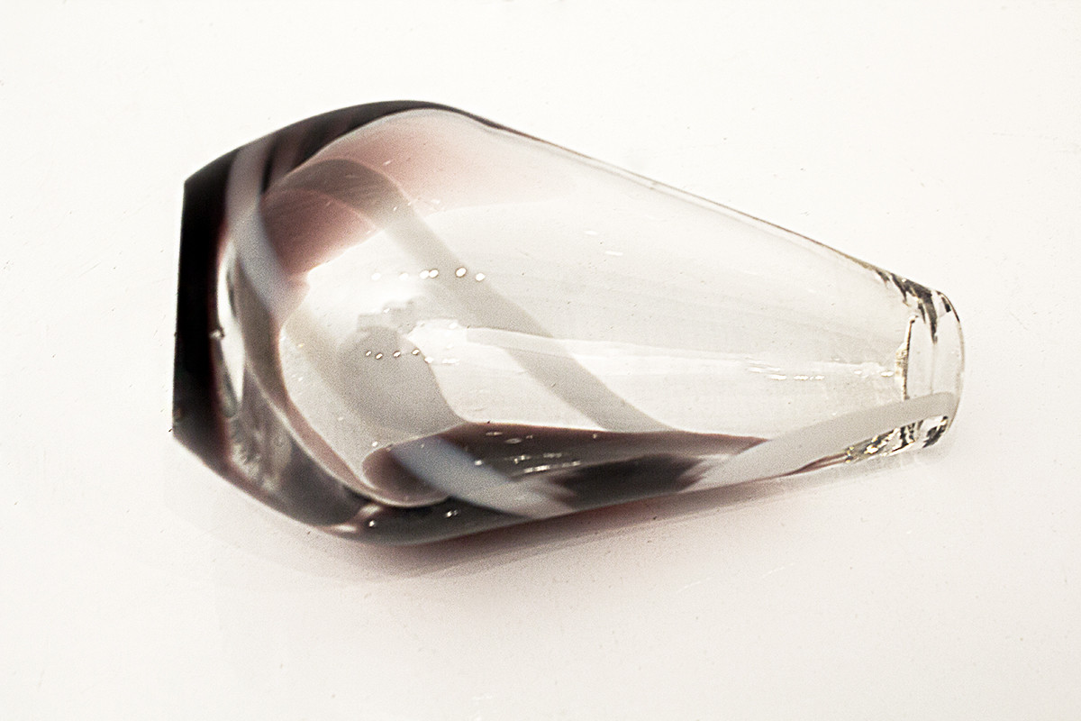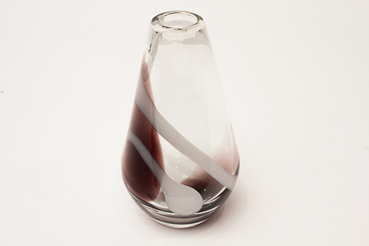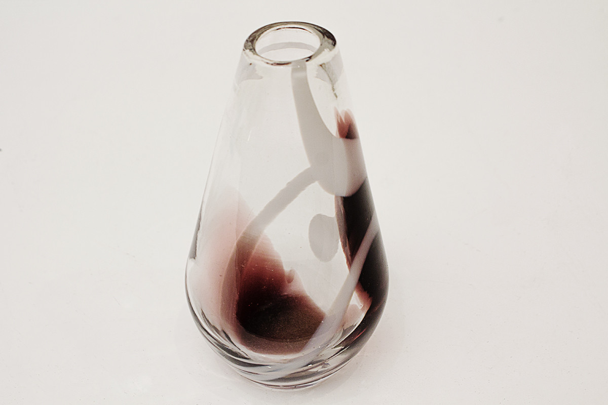 "Pear" shaped bud vase with white swirl & plum spots. Interesting layerd technique.