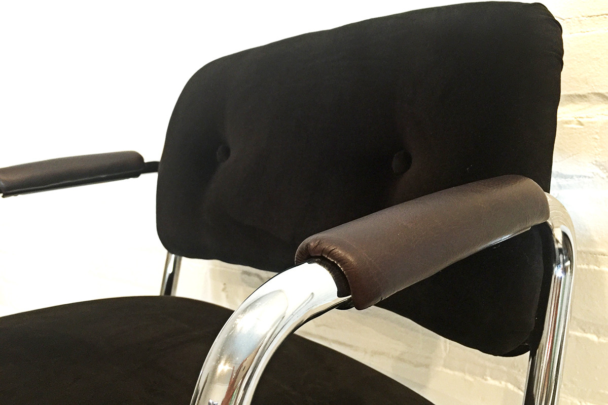 This chair is currently available and the style can be customized to order. We offer a choice of hardwood arms in black, natural or walnut finishes and a wide selection of upholstery.