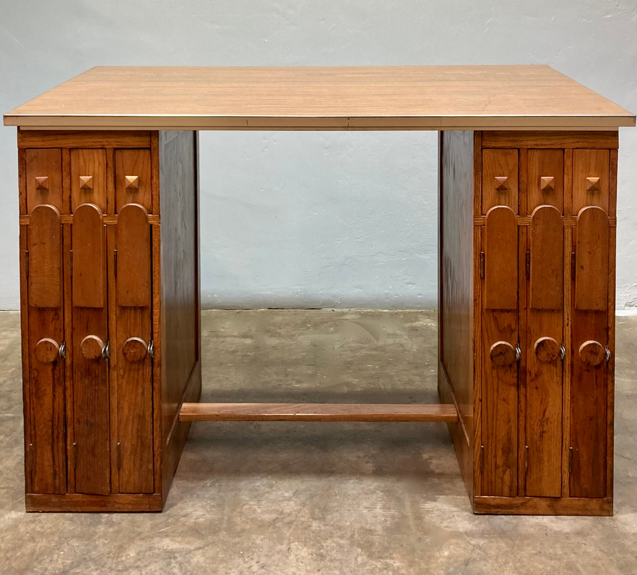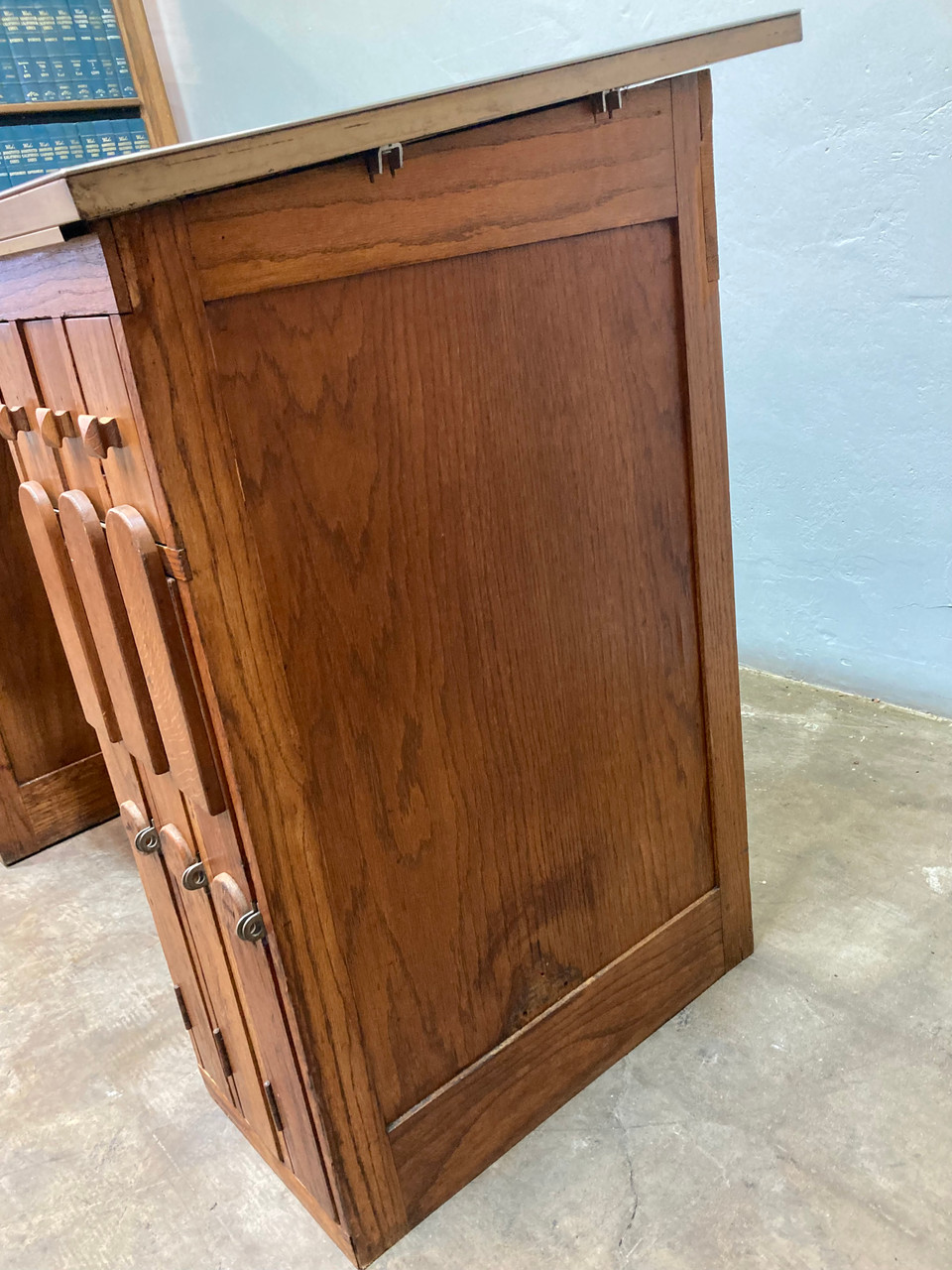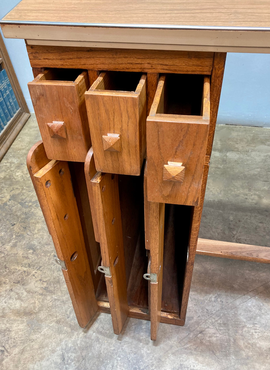 Awesome vintage drafting table base with 12 storage compartments, and a new table top reclaimed from a 1970's SteelCase desk. Standing height for use as a work table, drafting, or drawing.