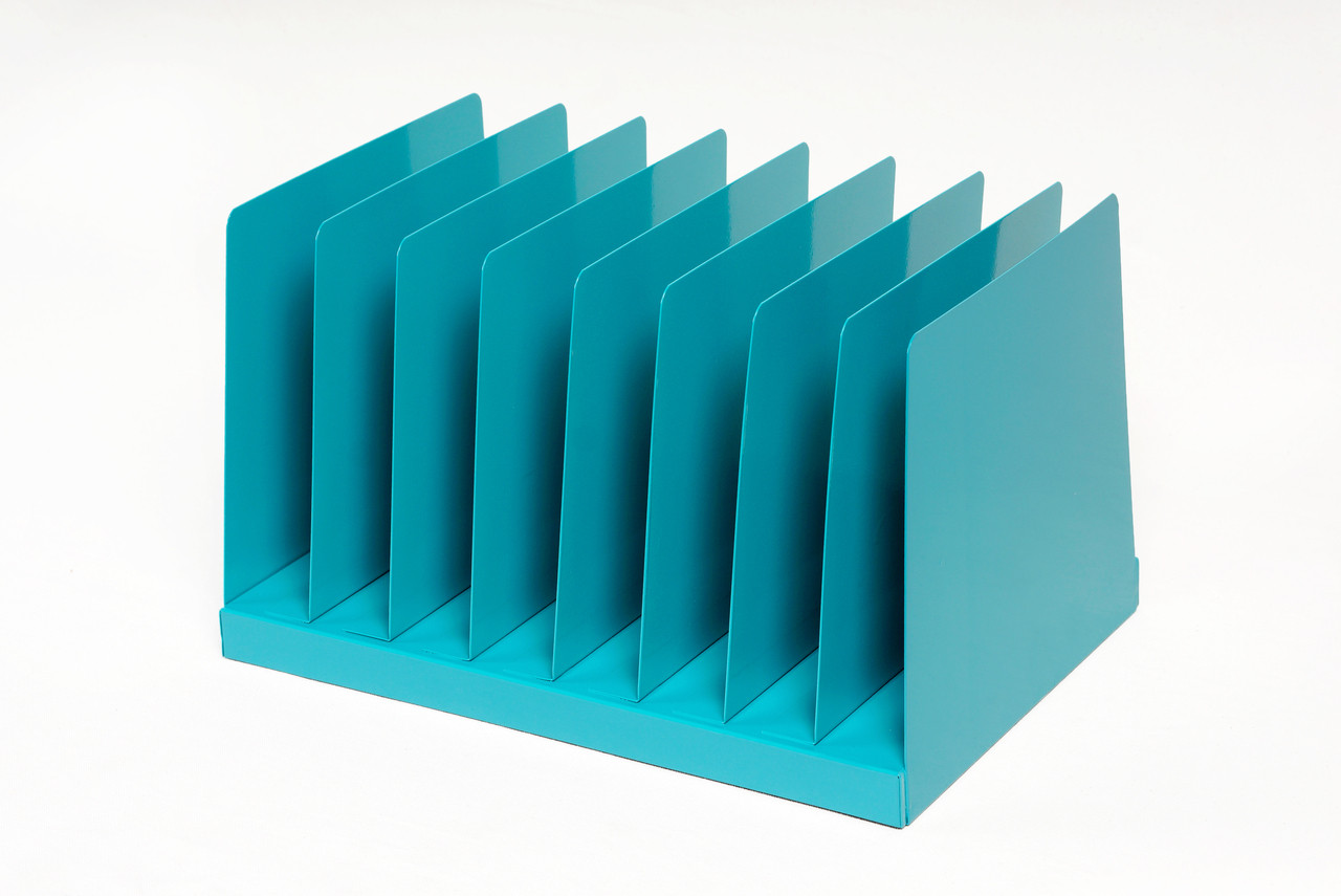 1970s steel office organizer refinished "Turquoise" (RAL5018). This style is uncommon, noteworthy for its eight-slot configuration. It's an iconic, multifunctional accessory ideal for sorting mail, memos or magazines and is sure to keep your desk in tip-top shape. Excellent refinished vintage condition.