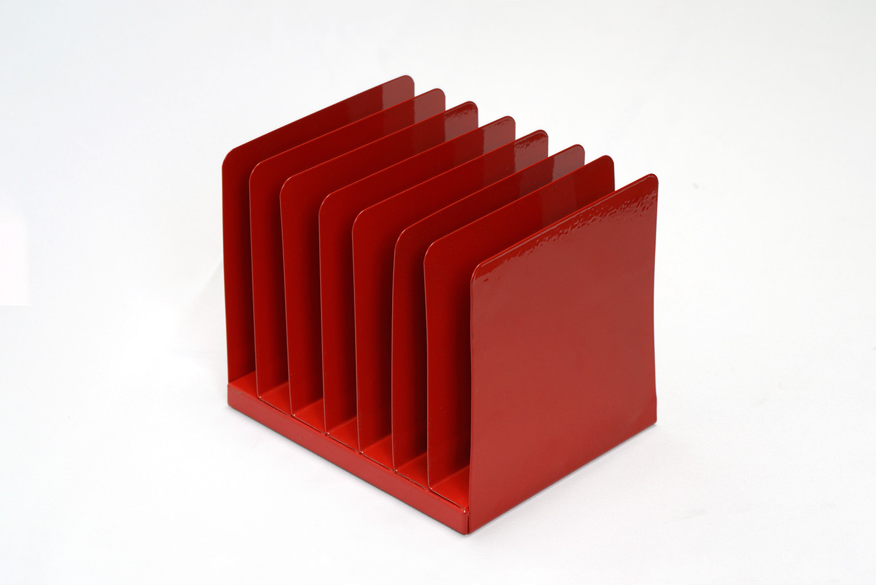 1970s retro office organizer refinished "Ruby Red" (RD03). We don't come across this mini size often; sits perfectly on your desk or shelf without getting in the way. This iconic accessory is multifunctional, ideal for sorting mail, memos or receipts. Features 7 slots sure to keep your desk in tip-top shape.