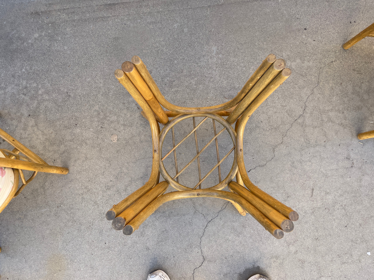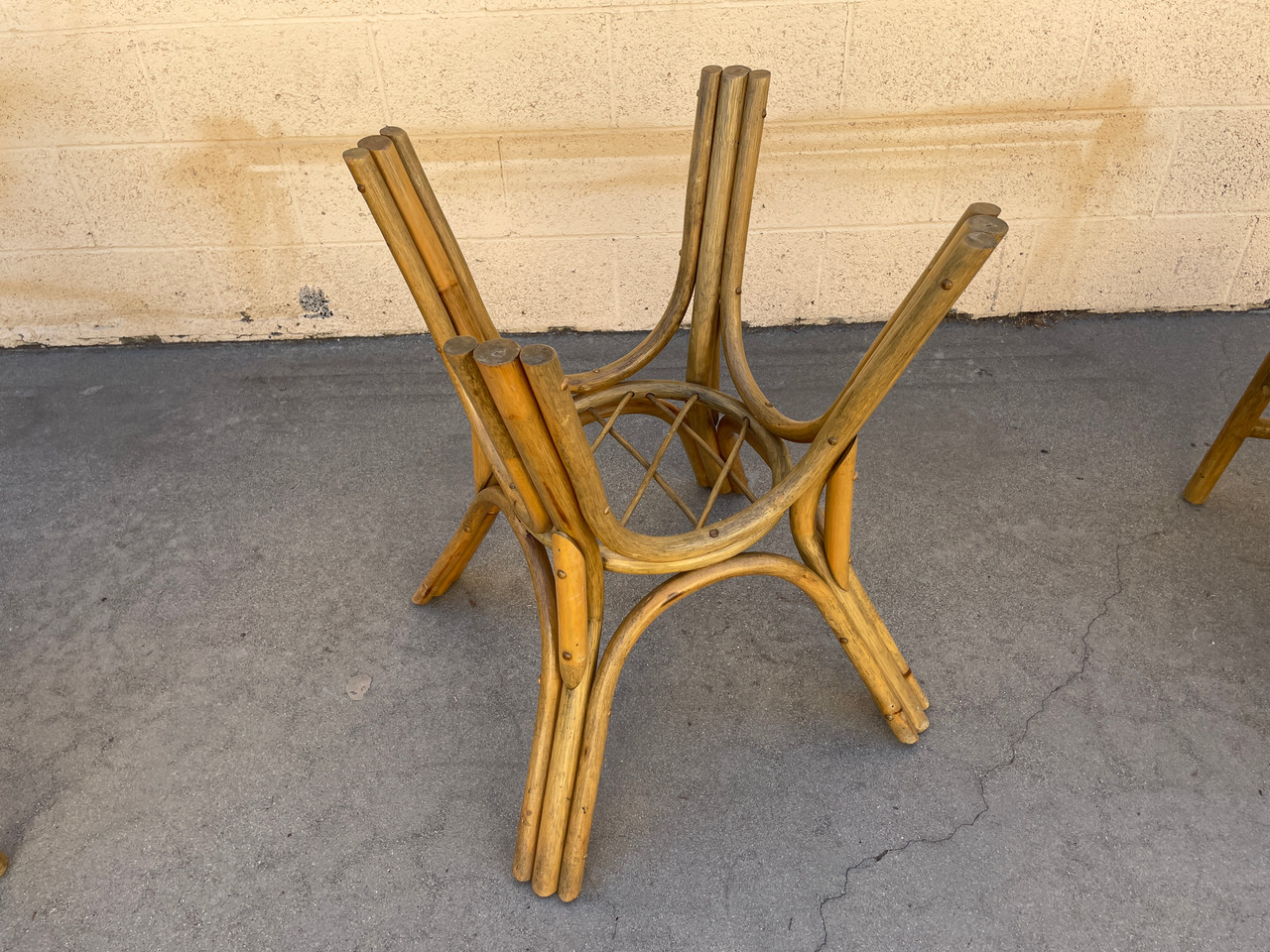 Unique split reed bamboo outdoor chair set. 4 Chairs and 1 table that needs a glass top.
