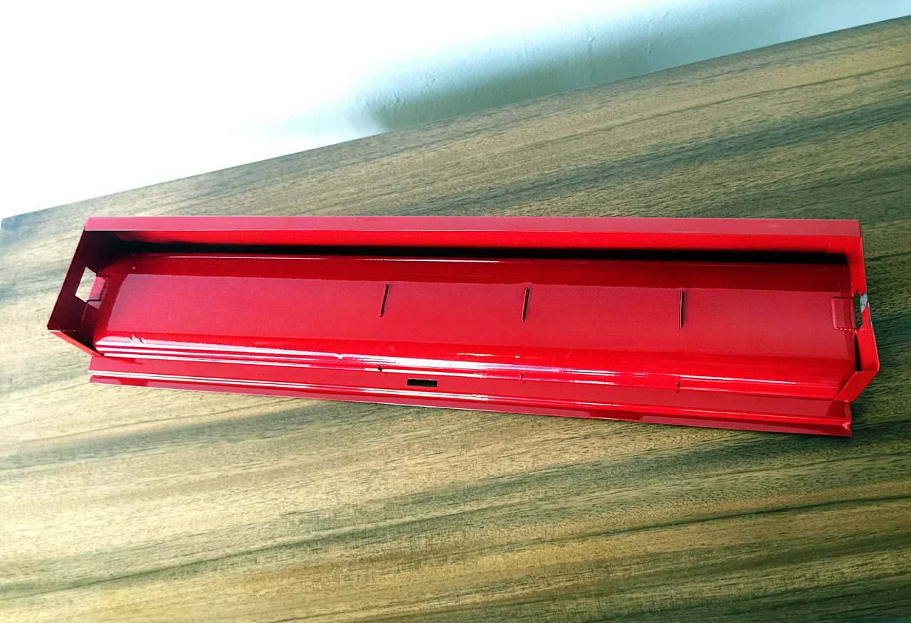 Once the insert to a Classic tanker desk's utility drawer, we repurposed this neat Industrial piece for use as a desktop organizer. Steel has been newly powder-coated in a pop of red. Features four slots, ideal for storing coins, pens and pencils and other small office supplies.