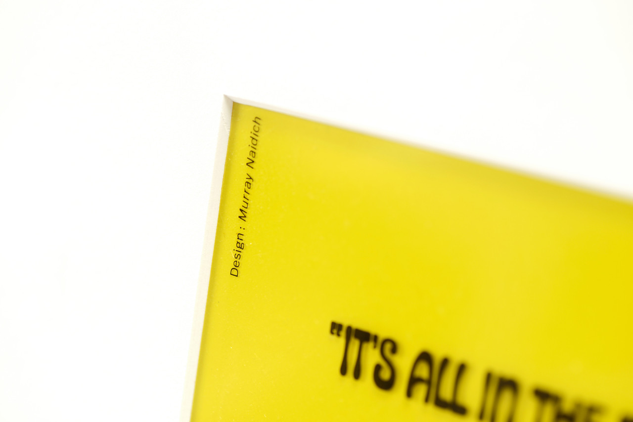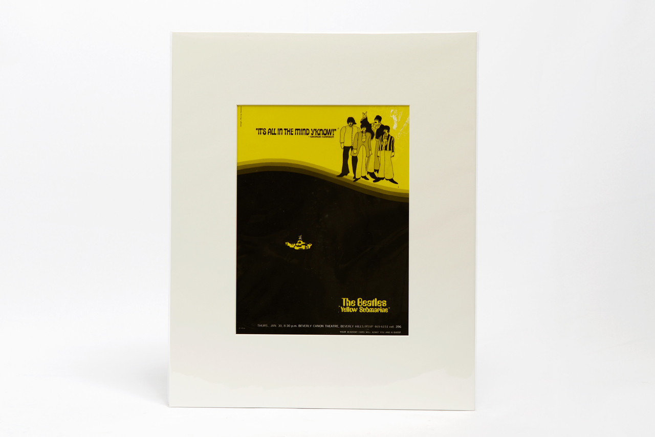 Authentic Beatles memorabilia! Vintage movie ad art transparency for screening of The Beatles' Yellow Submarine at the Beverly Canon Theater in Beverly Hills, CA, 1968. Original ad design by Murray Naidich. Newly prepared with new custom acid-free overlay mat and protective plastic sleeve. Overall in excellent vintage condition with gentle surface wear to top right corner as pictured. 1 available.