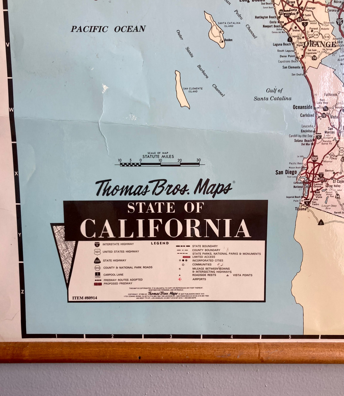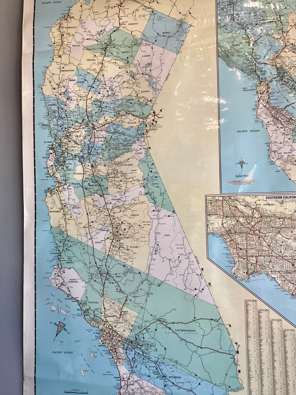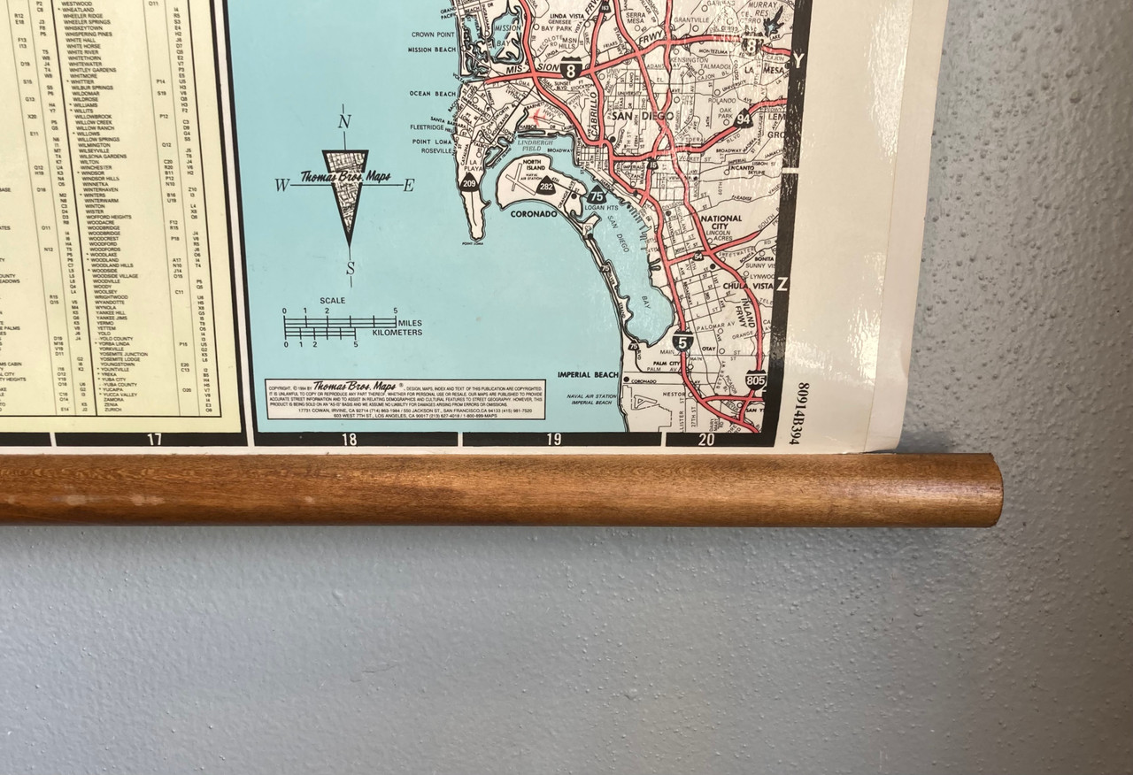 Fantastic vintage 1994 Thomas and Bro's map of the entire state of California. Map has cut-out details of the Bay Area and Los Angeles. Freeways and counties are all depicted in a muted color palette. Top and bottom are anchored by wooden dowels, and top has two loops for easy hanging.