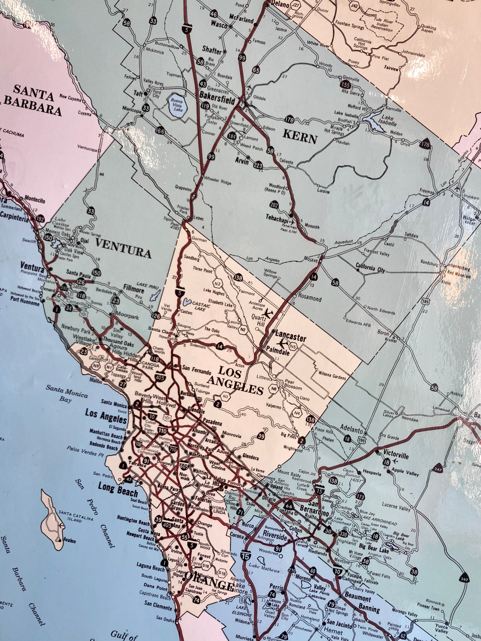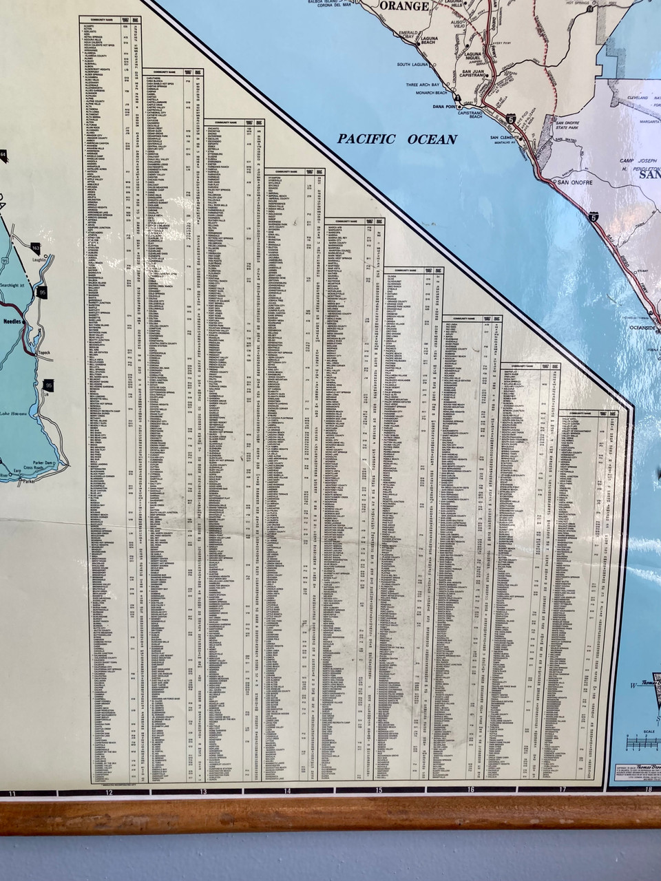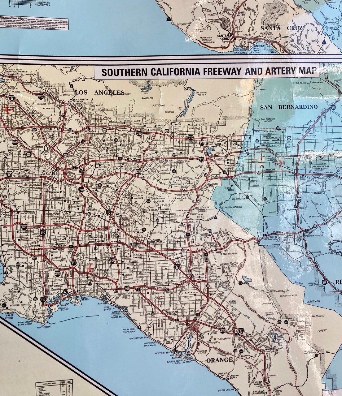 Fantastic vintage 1994 Thomas and Bro's map of the entire state of California. Map has cut-out details of the Bay Area and Los Angeles. Freeways and counties are all depicted in a muted color palette. Top and bottom are anchored by wooden dowels, and top has two loops for easy hanging.