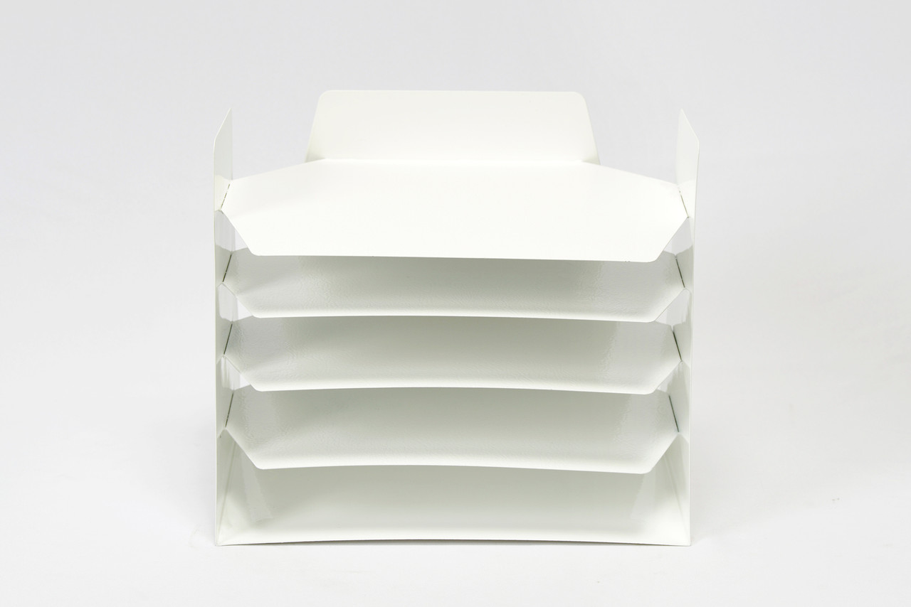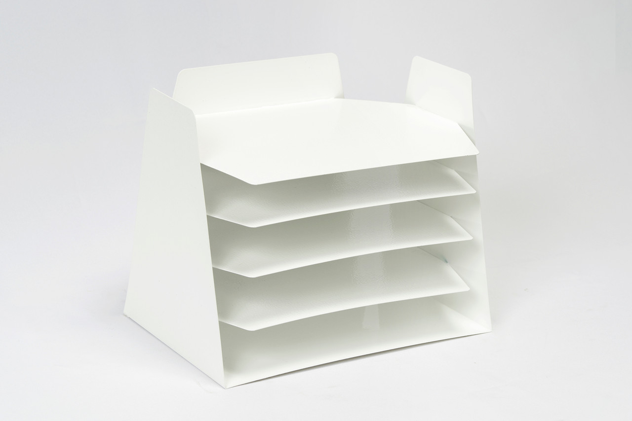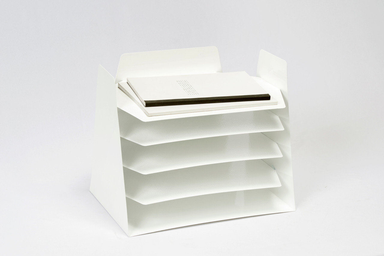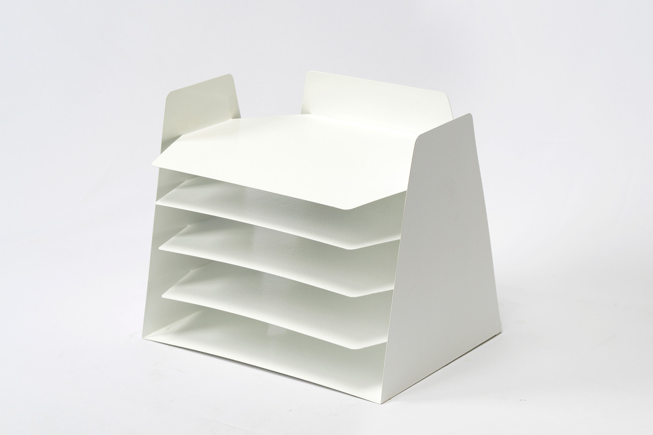 Powder coat refinished in gloss white. This iconic accessory is multifunctional, ideal for sorting mail, memos or magazines; sure to keep your desk in tip-top shape.