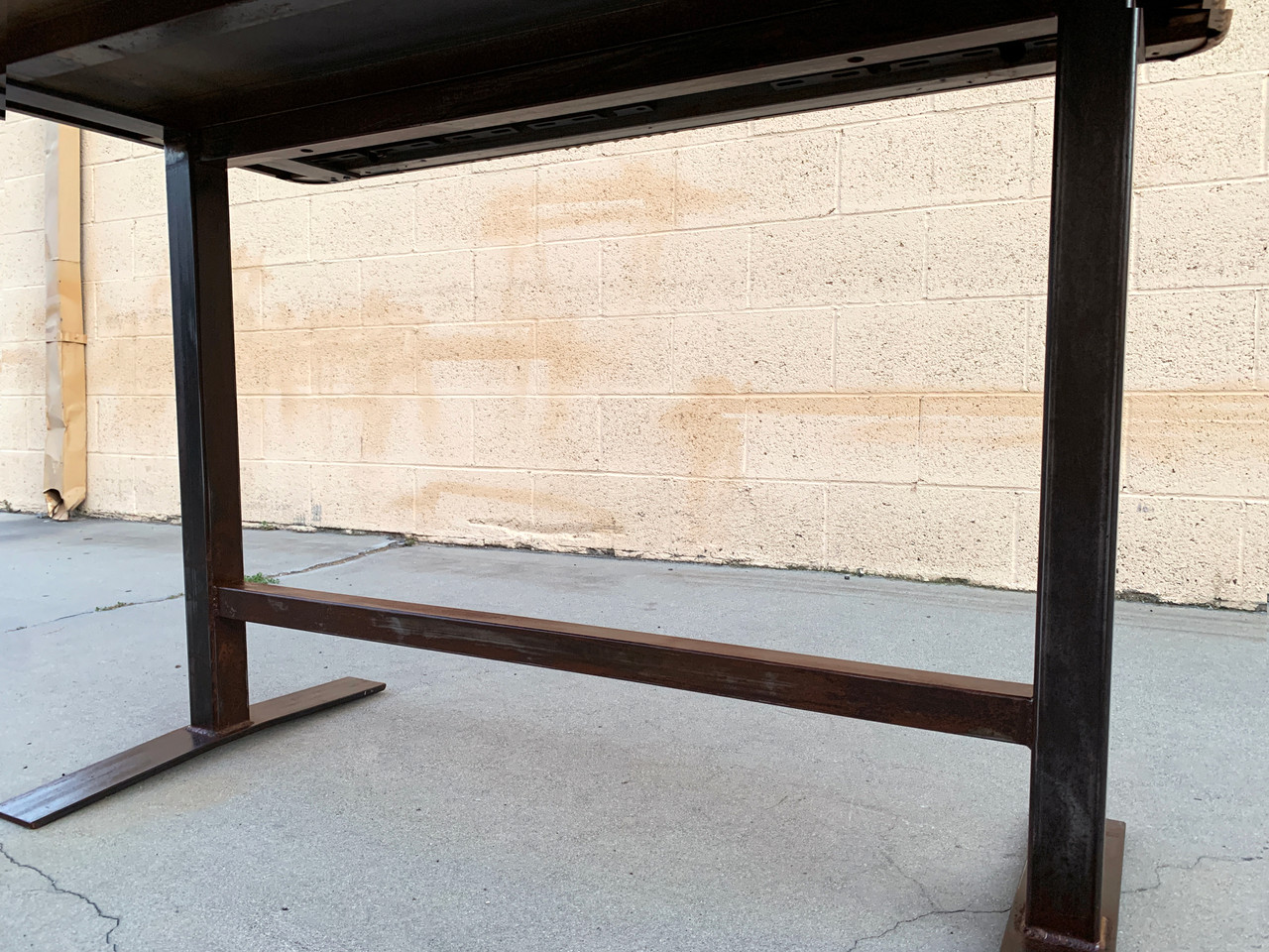 This unique piece is a combination of a mid century tanker table top mounted on a custom made steel base. We refinished the top with resin– the super high gloss accentuates the distressed patina. This retro-industrial table is a great option for an office or retail space.