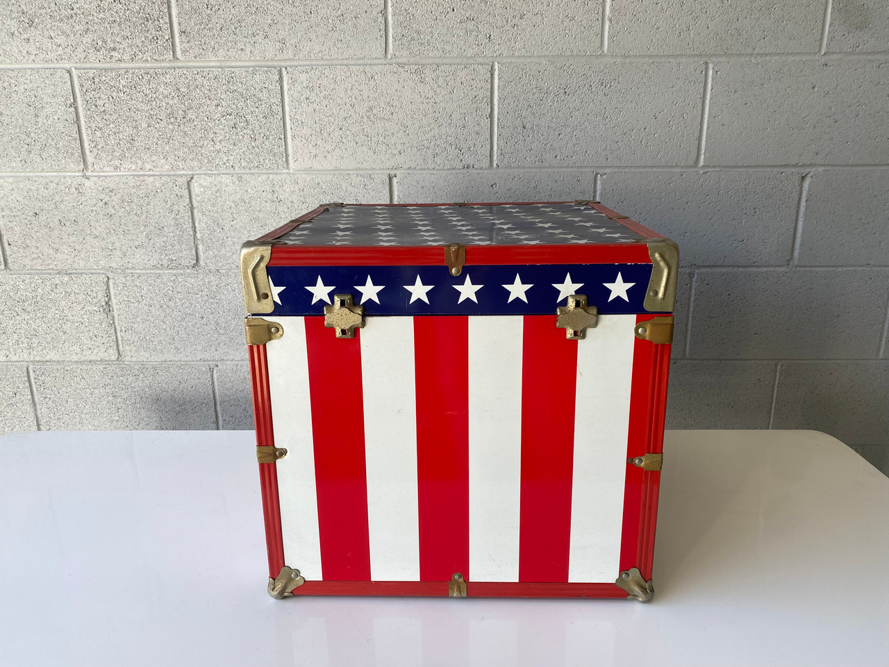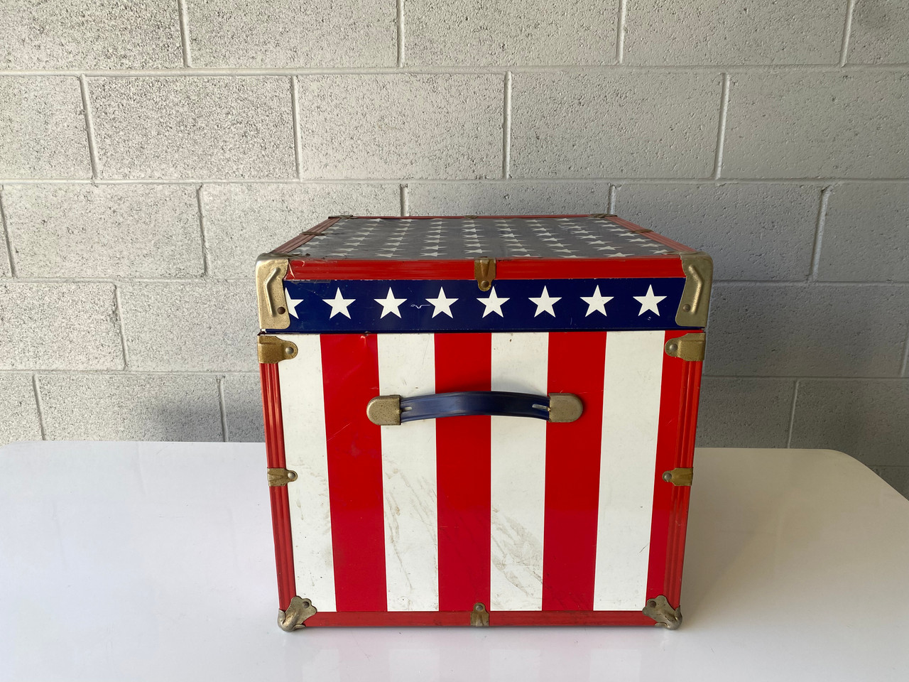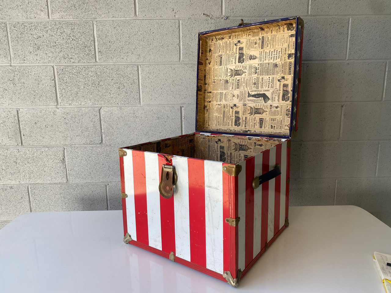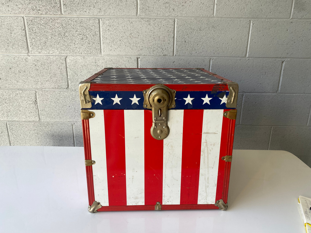 Vintage USA American flag themed chest / trunk. Features newspaper lining on the inside for a unique vintage feel. Original hardware, ability to lock.