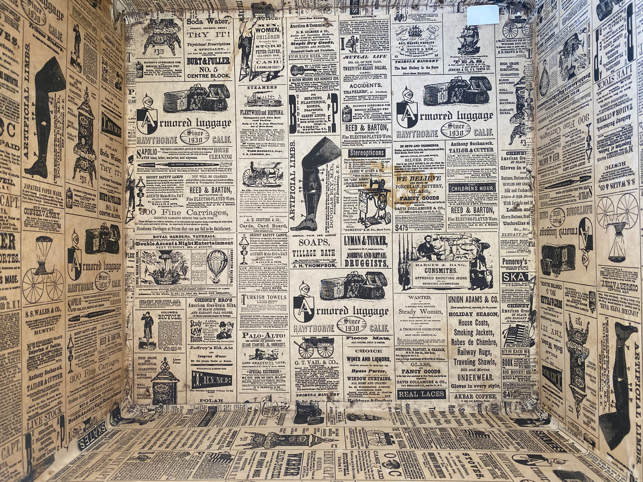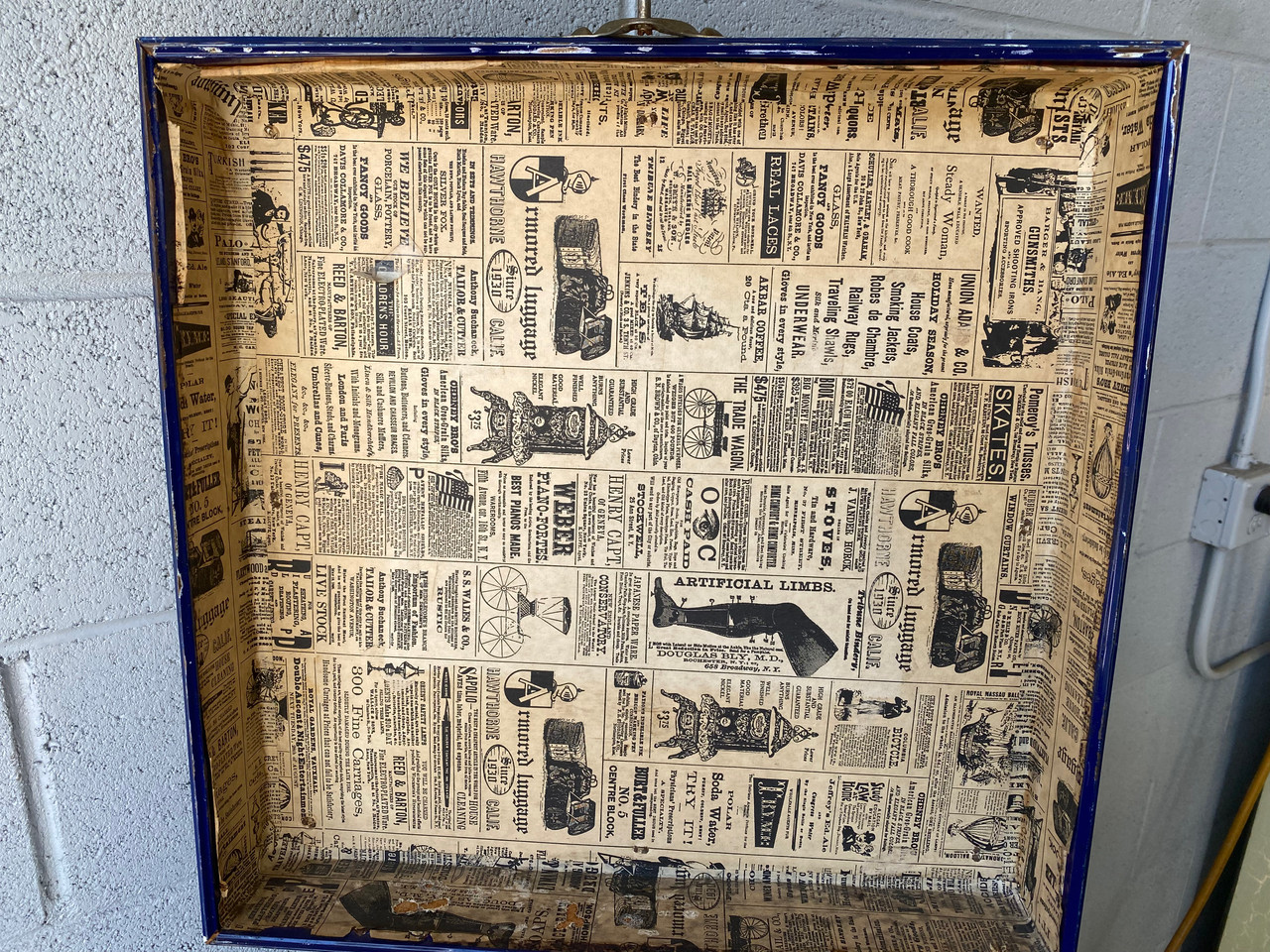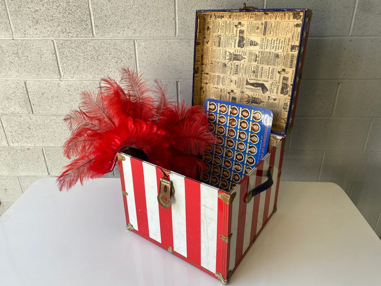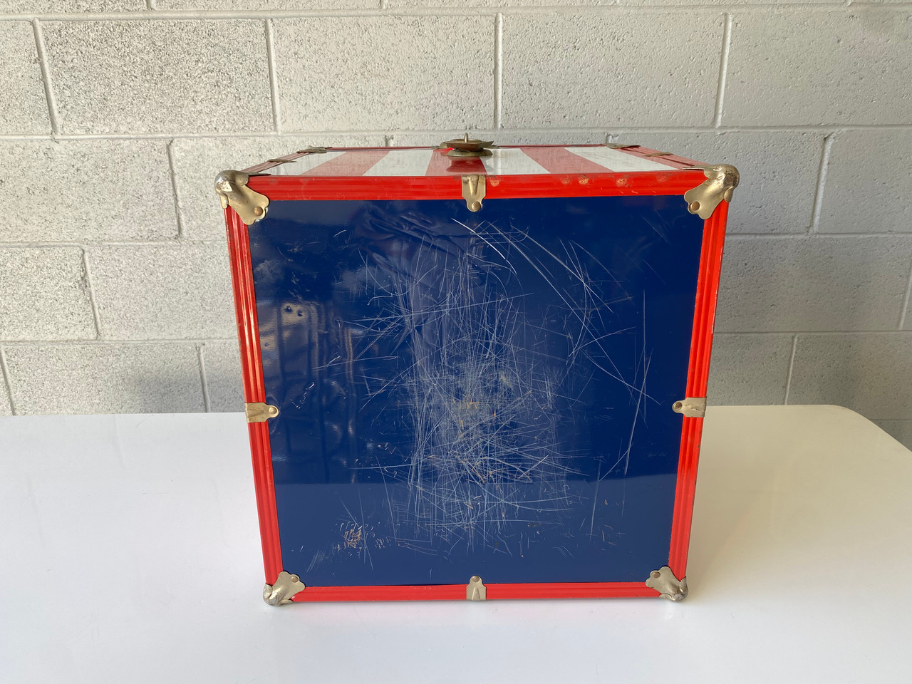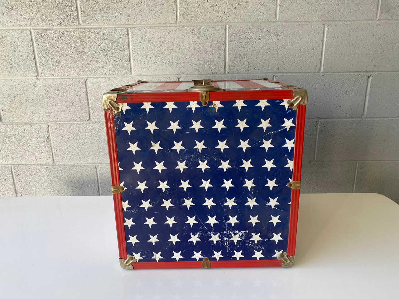 Vintage USA American flag themed chest / trunk. Features newspaper lining on the inside for a unique vintage feel. Original hardware, ability to lock.