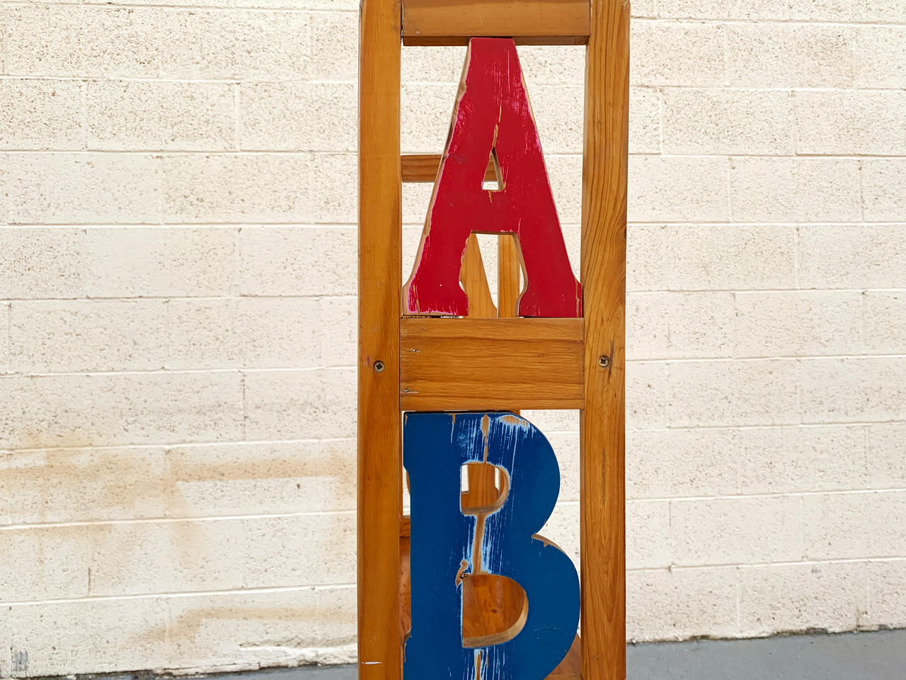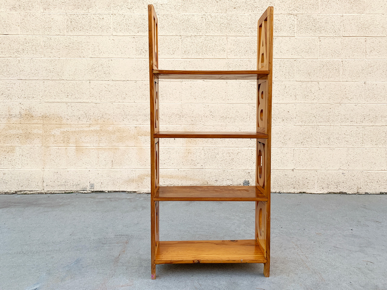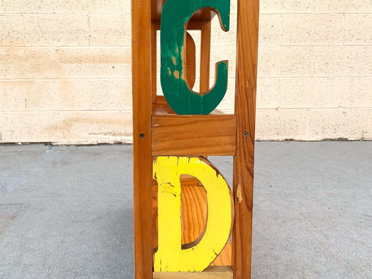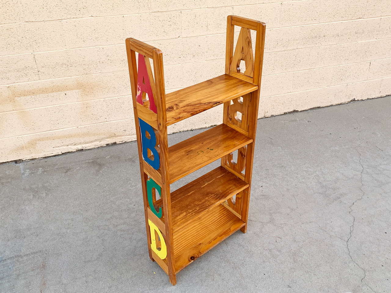 Vintage kid's alphabet bookshelf made of pine with painted letters. Fun for the whole family! Great vintage patina. Wood has been reconditioned and is slightly warped but stable.