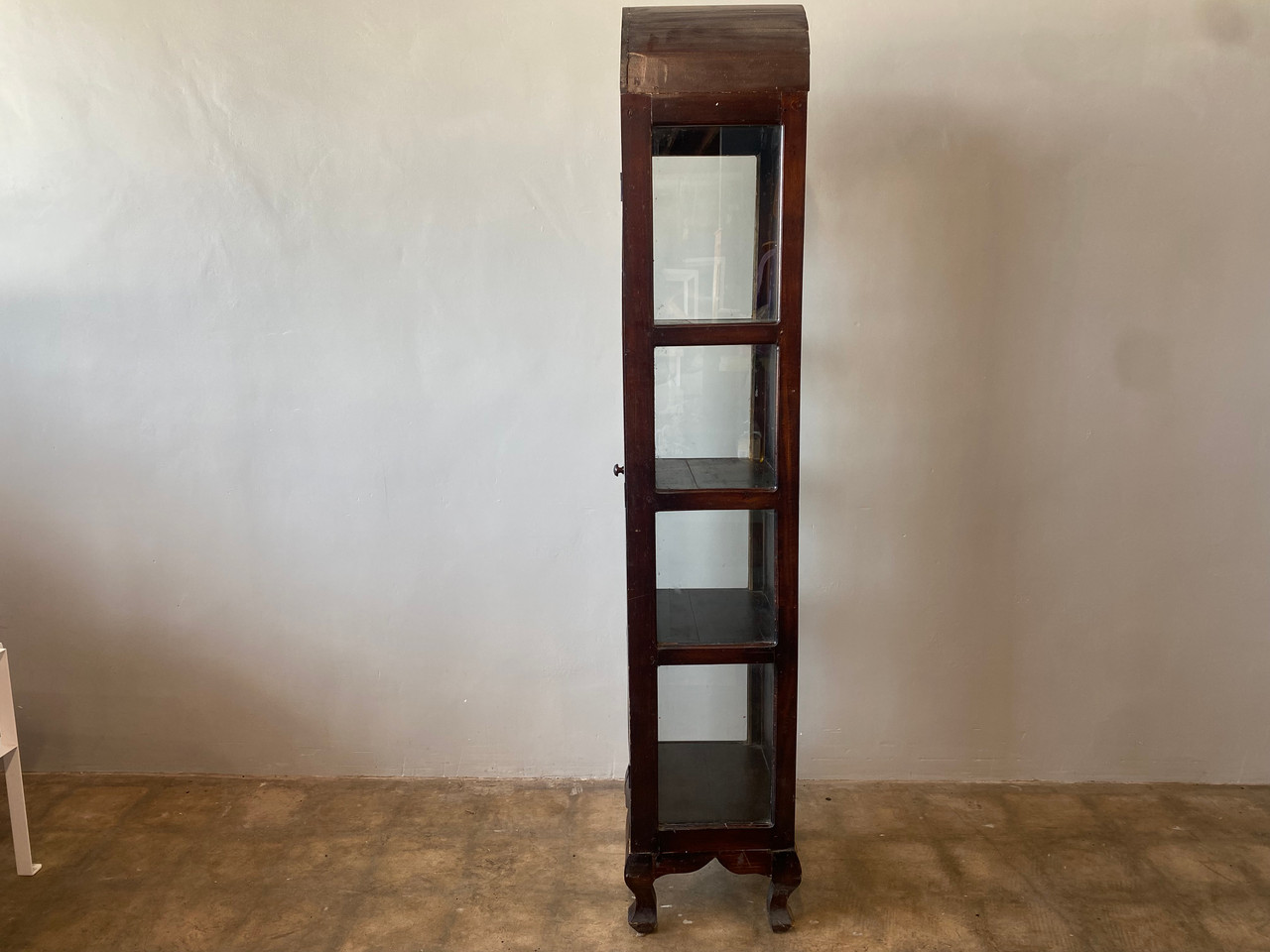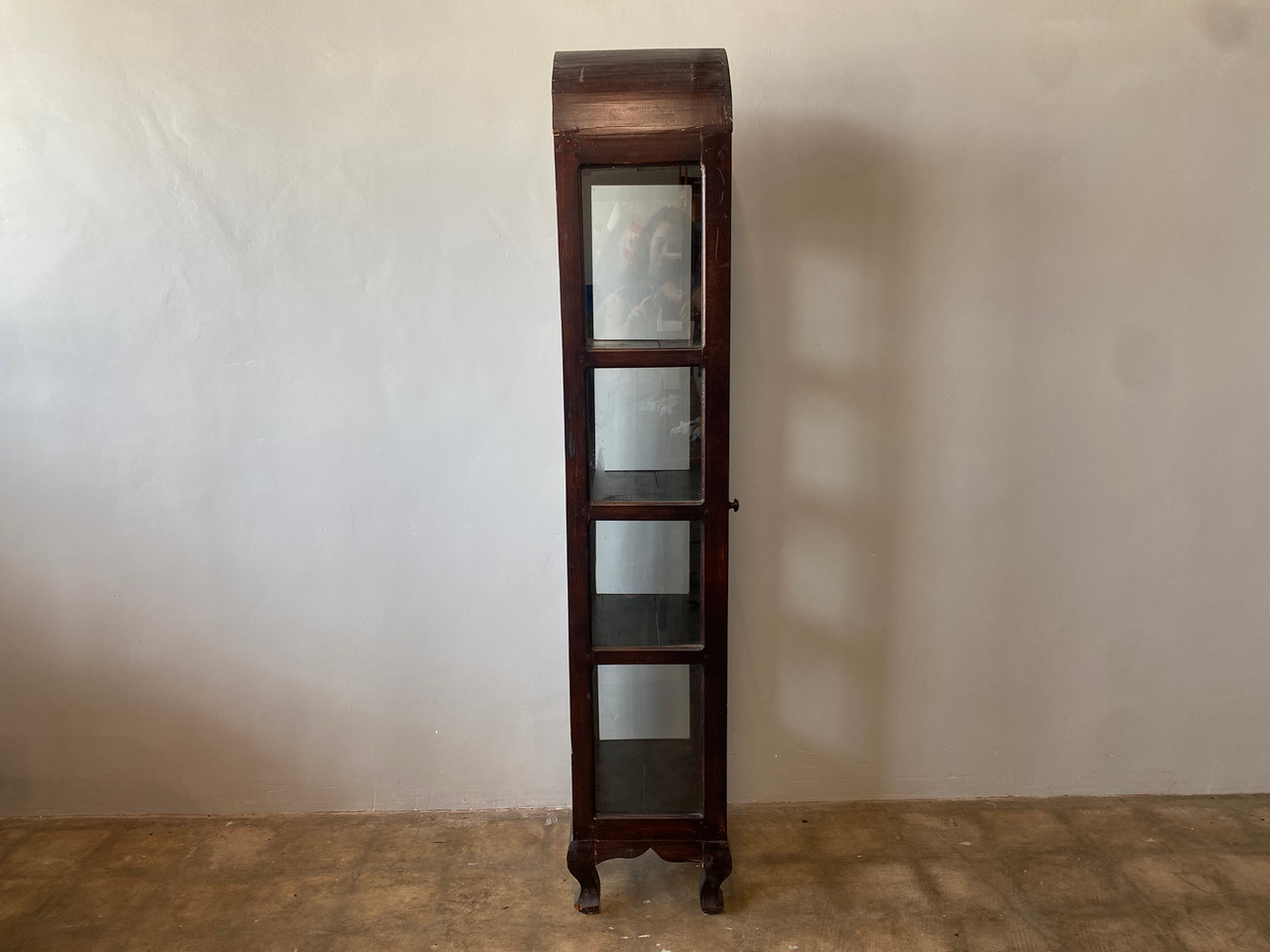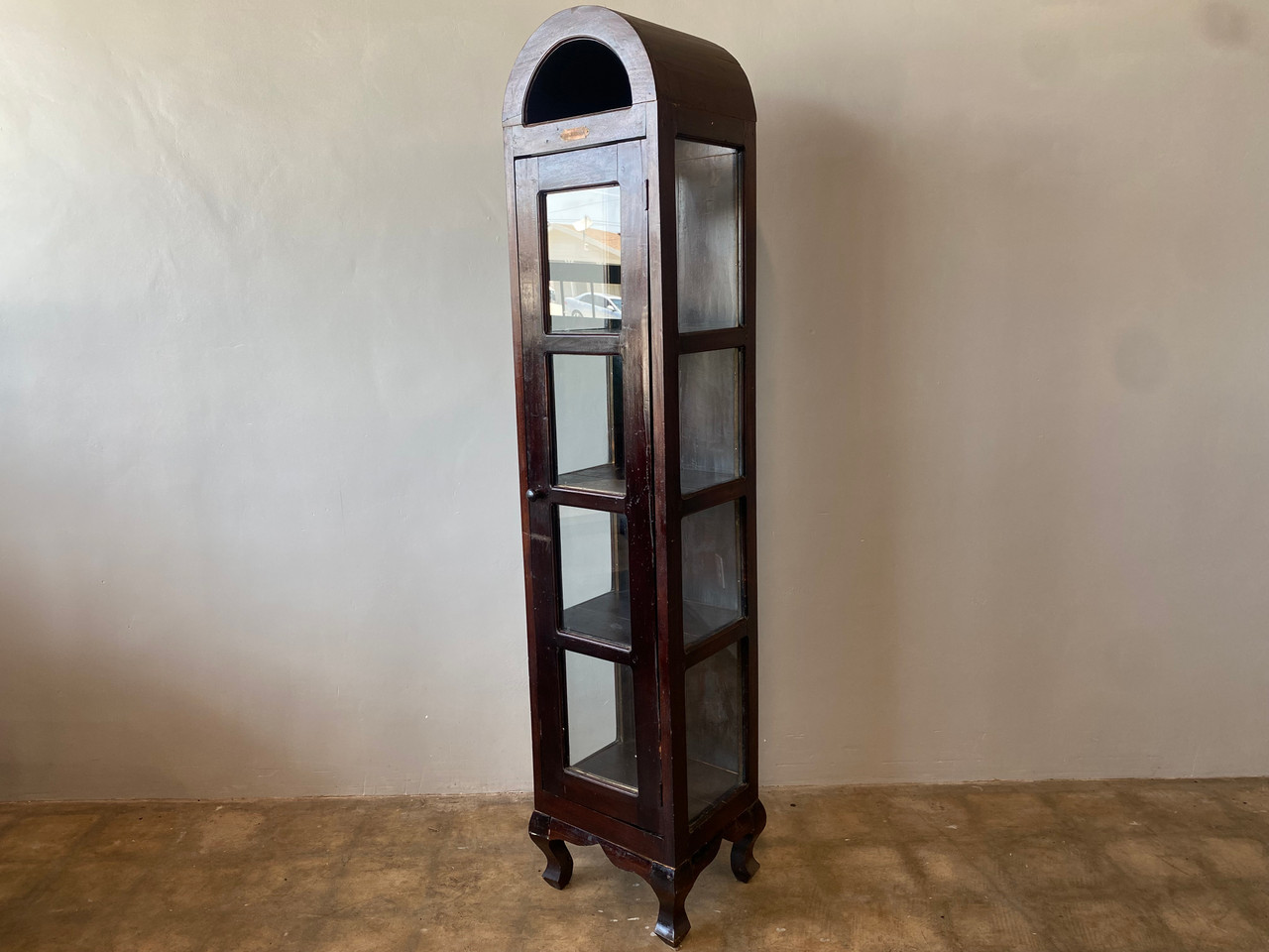 Vintage Almadora curio / display cabinet. Stands tall and narrow with glass on three sides. Features 4 shelves, arched top, adn beautiful claw feet.