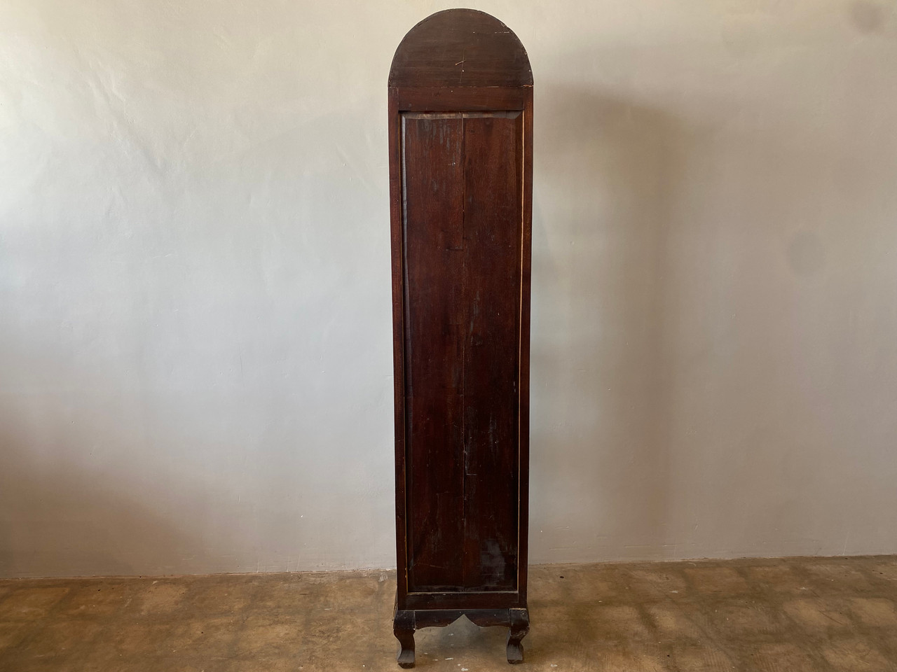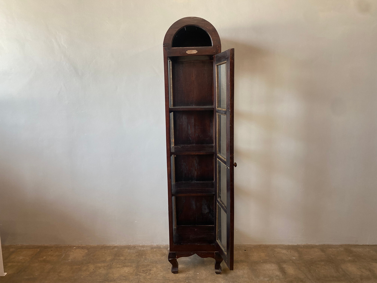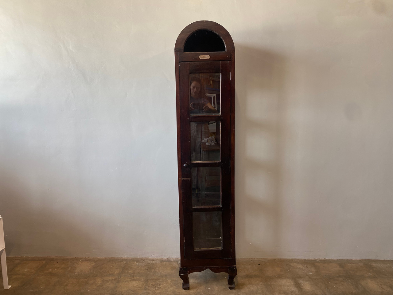 Vintage Almadora curio / display cabinet. Stands tall and narrow with glass on three sides. Features 4 shelves, arched top, adn beautiful claw feet.