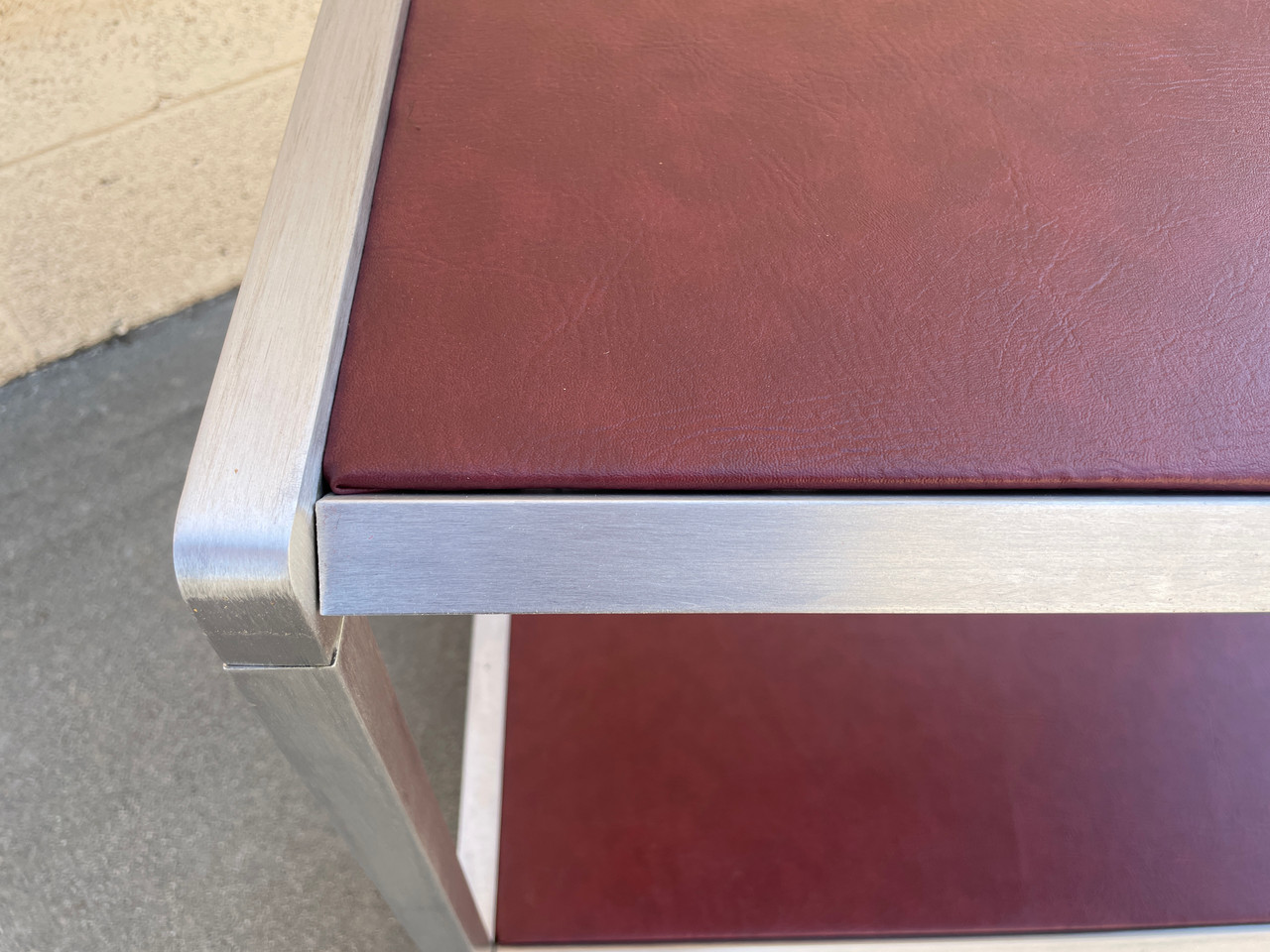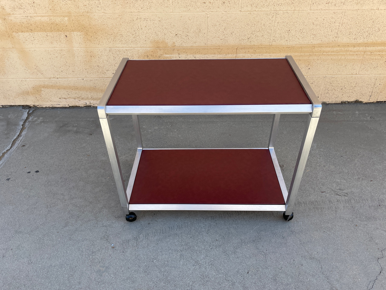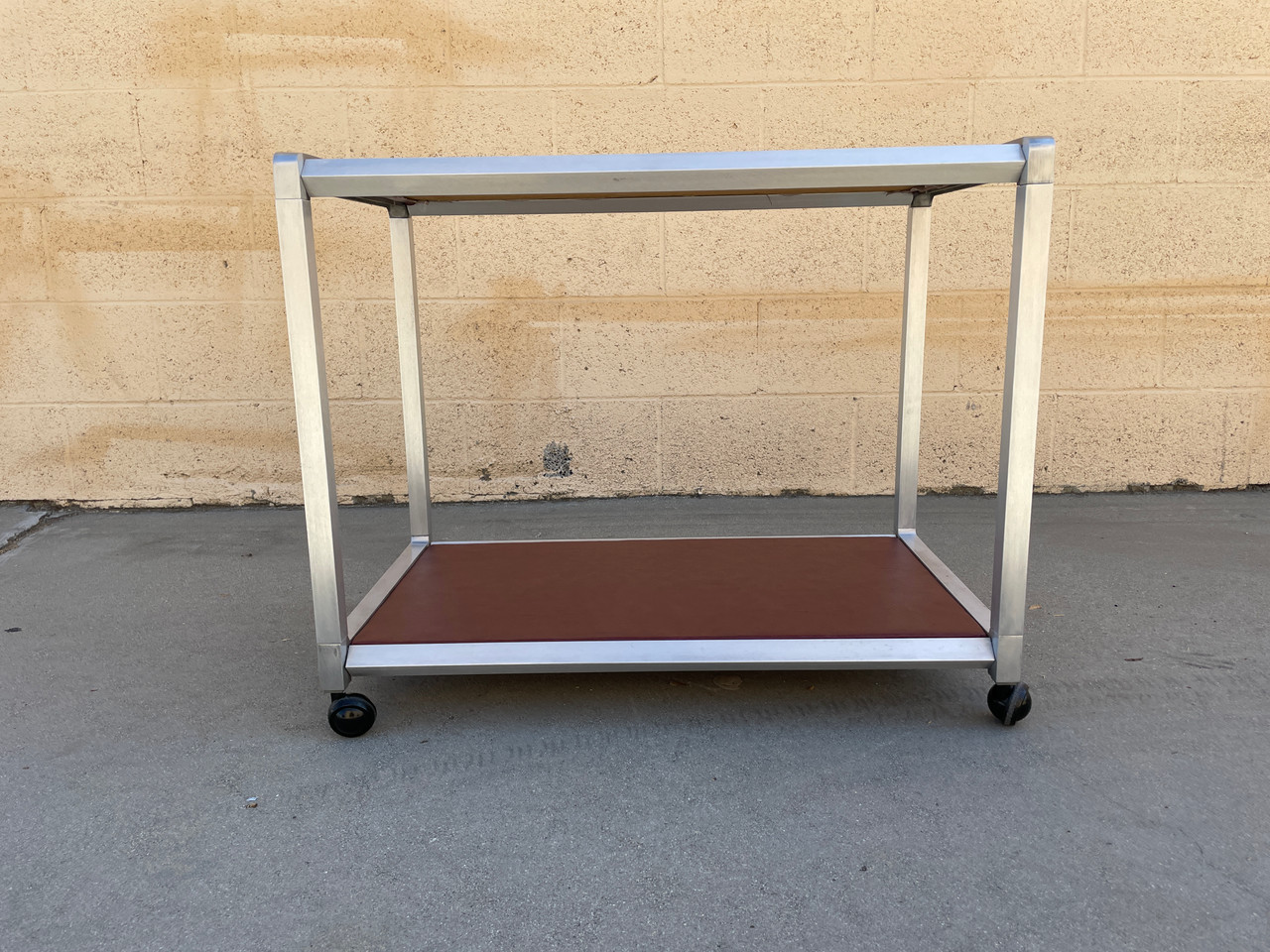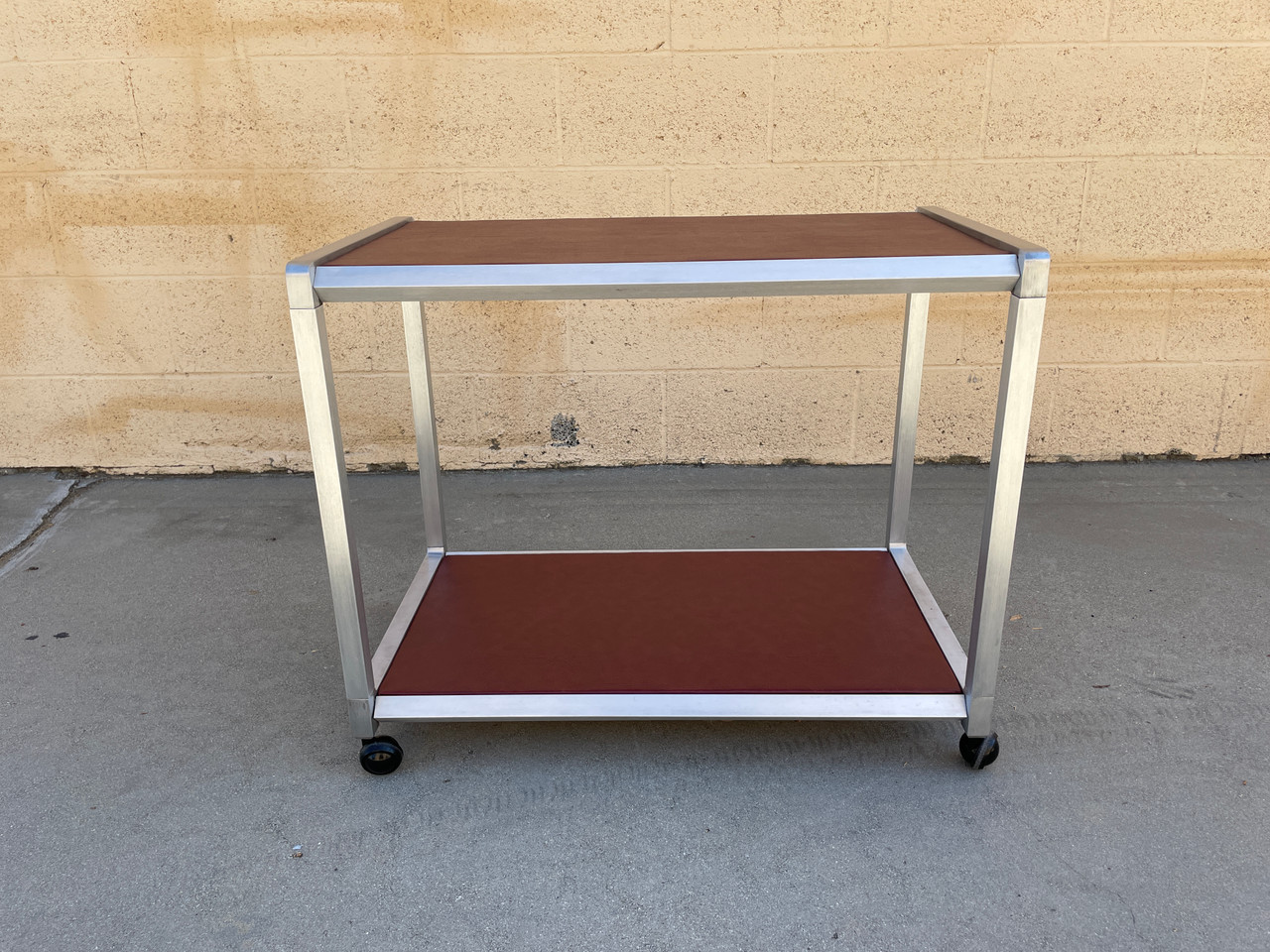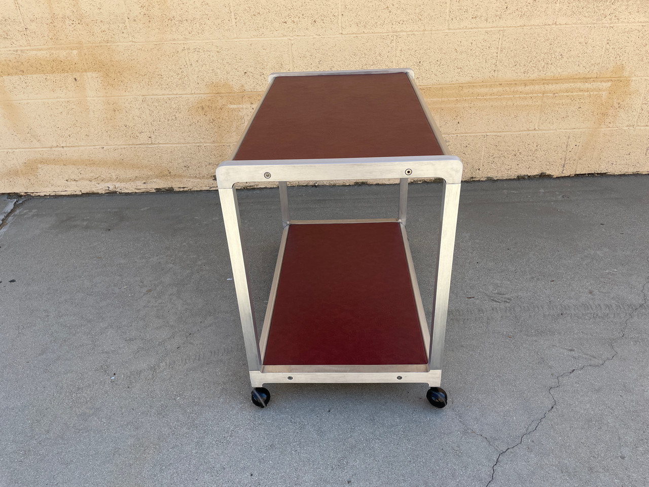 Unique mid-century aluminum frame rolling cart. Aluminum has been brushed out with clear lacquer top coat. New vinyl on shelves.