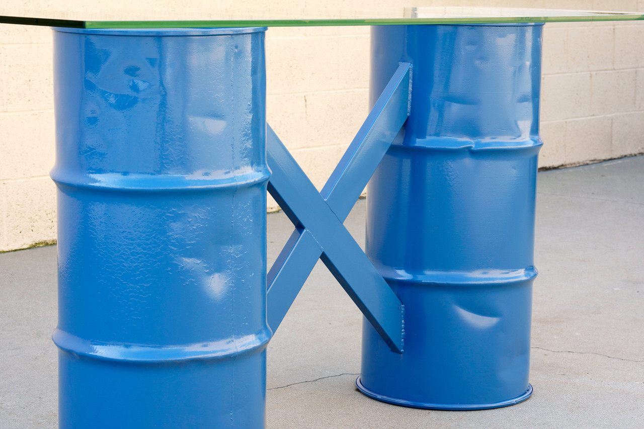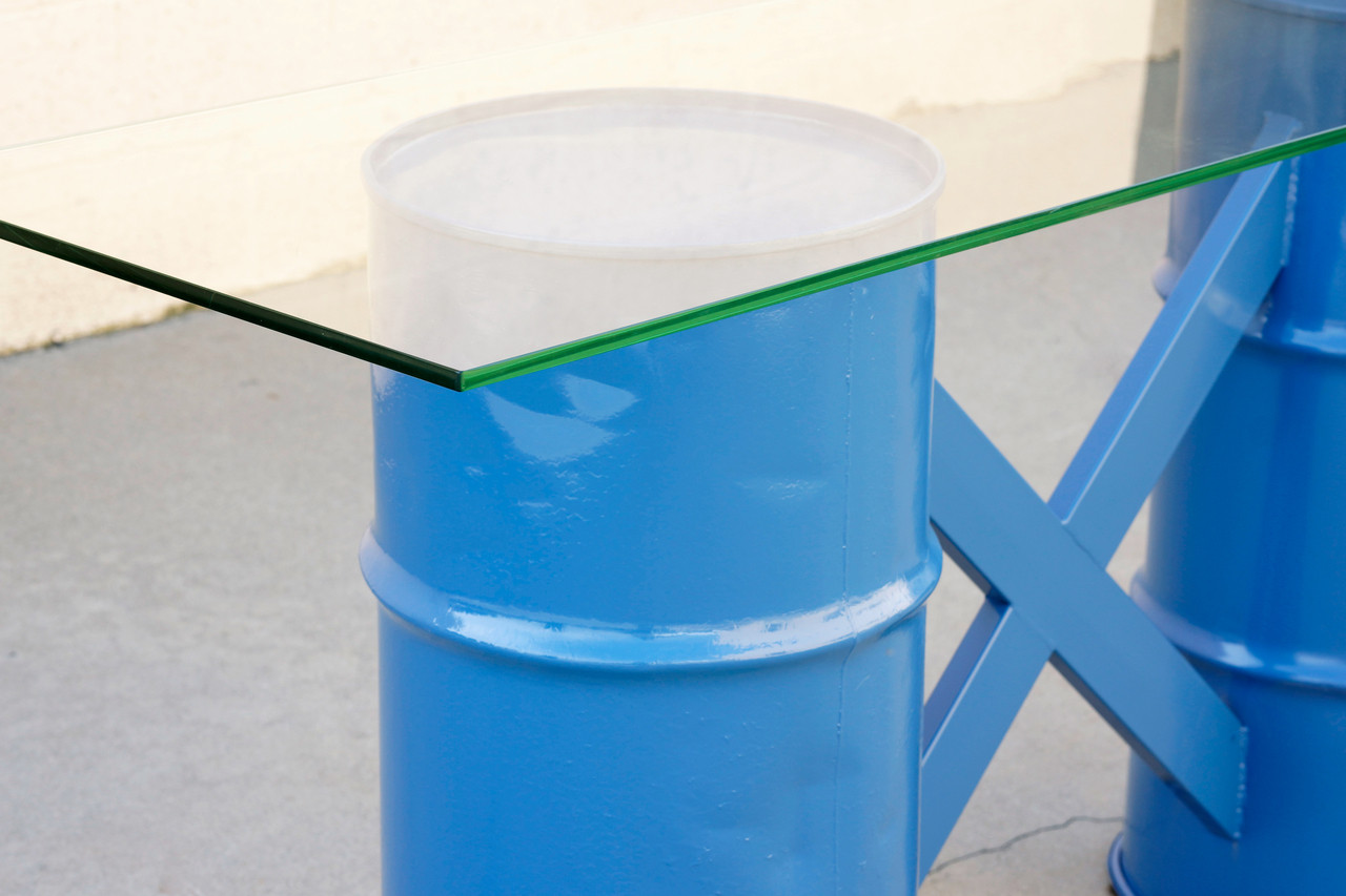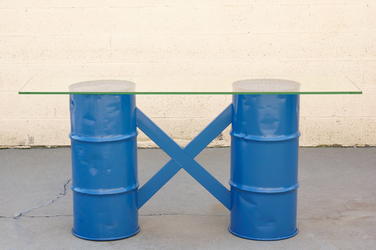 One-of-a-kind console table made from reclaimed army surplus ammunition barrels. Powder coated in a pop of bright blue and paired with a 1/2" glass top. This table has lots of character and history.