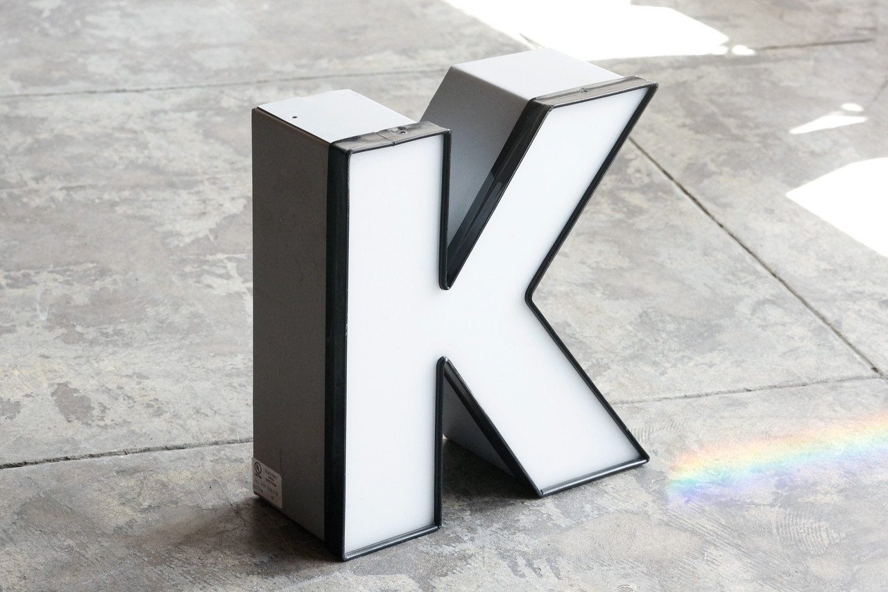 Excellent vintage channel letter "K" in white with black trim and grey frame. Graphic boxy font. Ready-to-hang straight on the wall or arrange as an accent piece. This letter is extra-large and in good vintage condition.