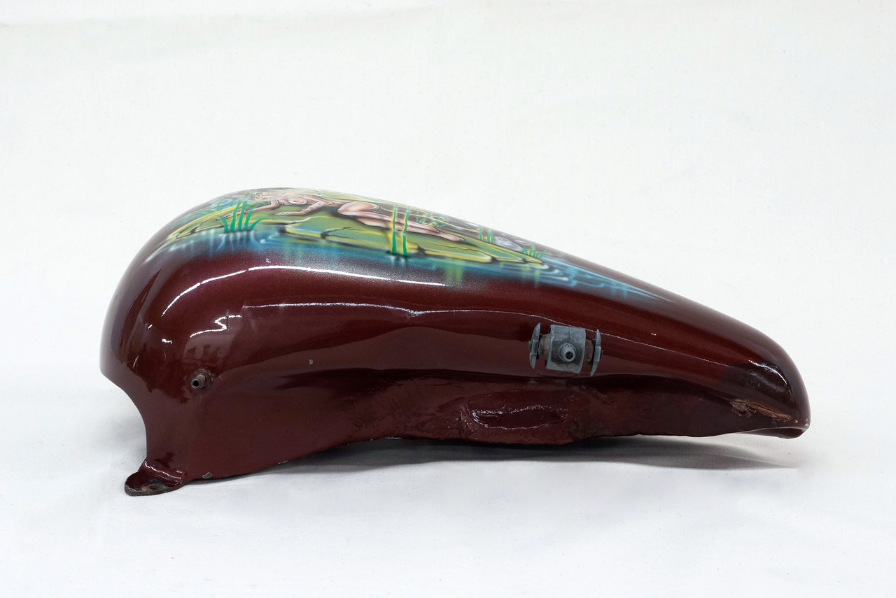 Very cool Harley Davidson Chopper gas tank with custom airbrush paint paint job. Excellent retro/ cult style rendering of sexy swamp lady beneath "She and I" slogan. Probably from the 70s. Paint shows gentle signs of wear as pictured. Artist unknown.