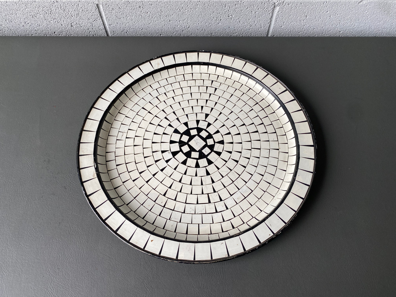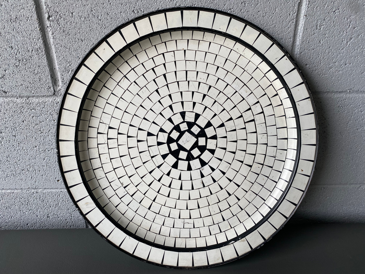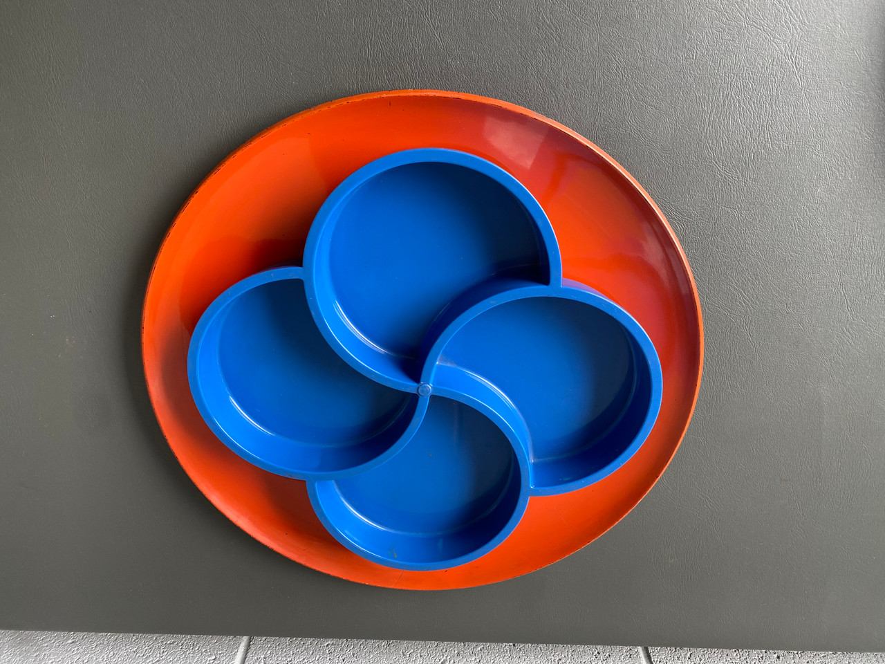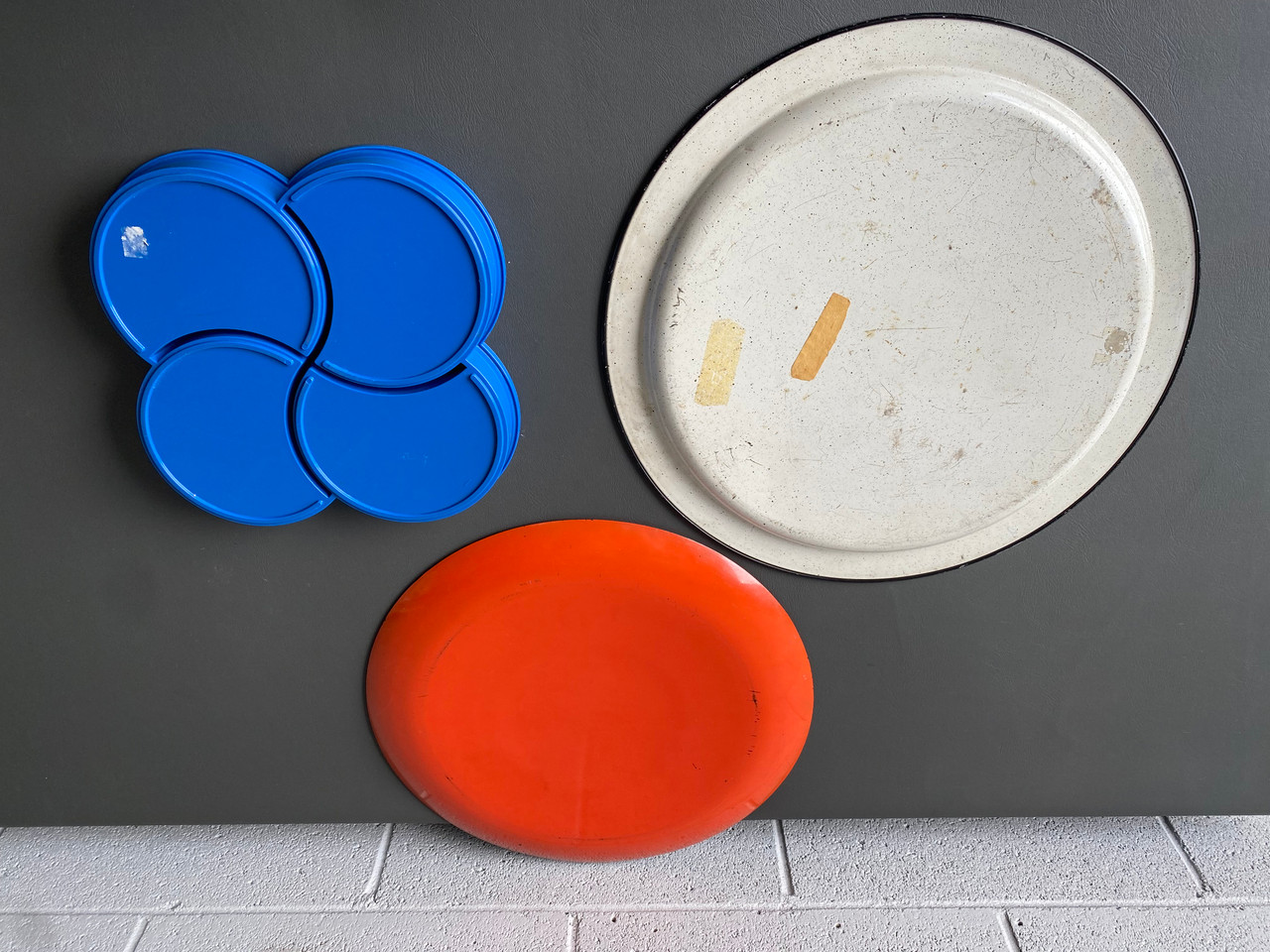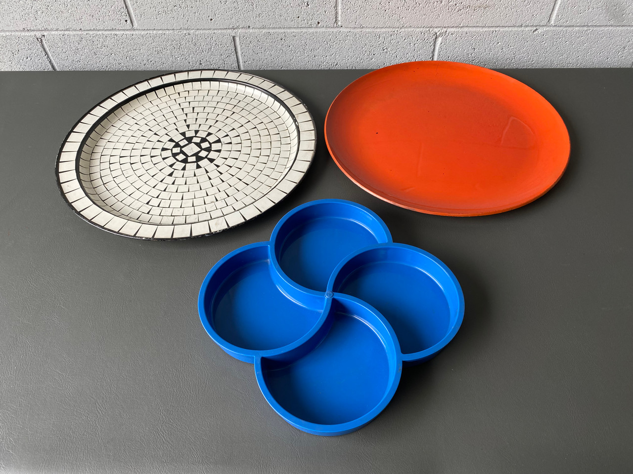 Set of three mid century trays. Bright blue with 3 compartments, and a larger orange plastic tray. One beautiful black and white mosaic metal tray.