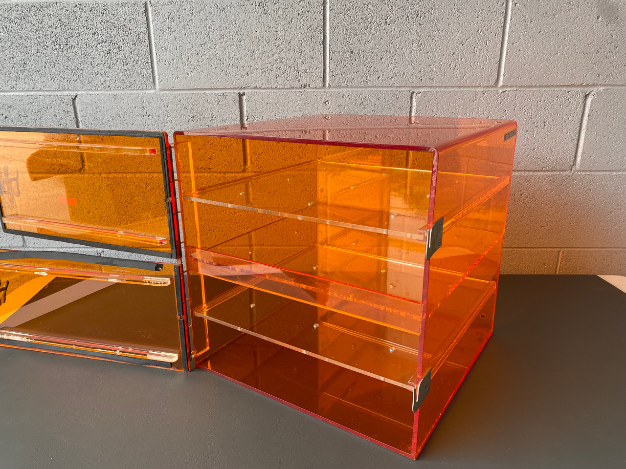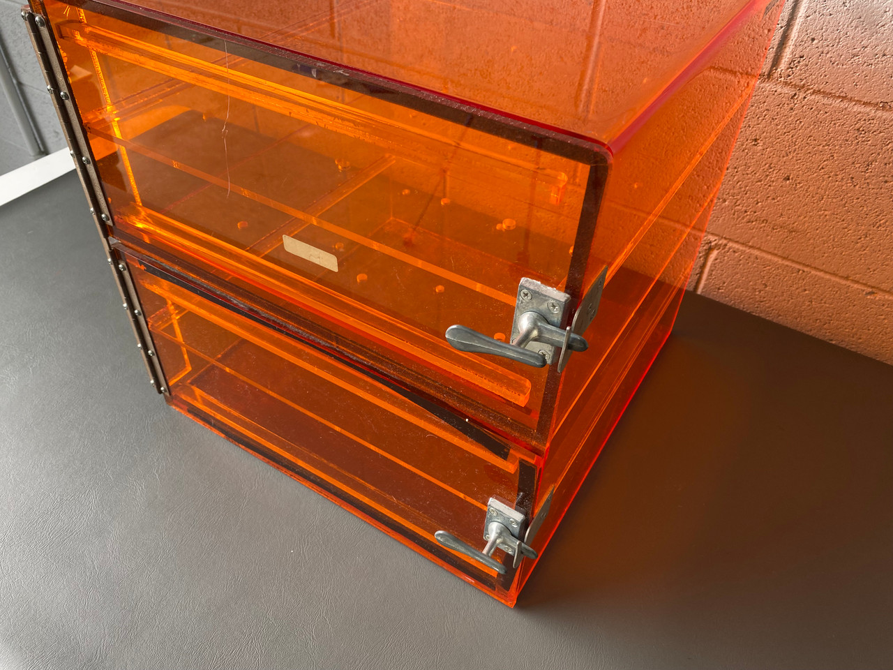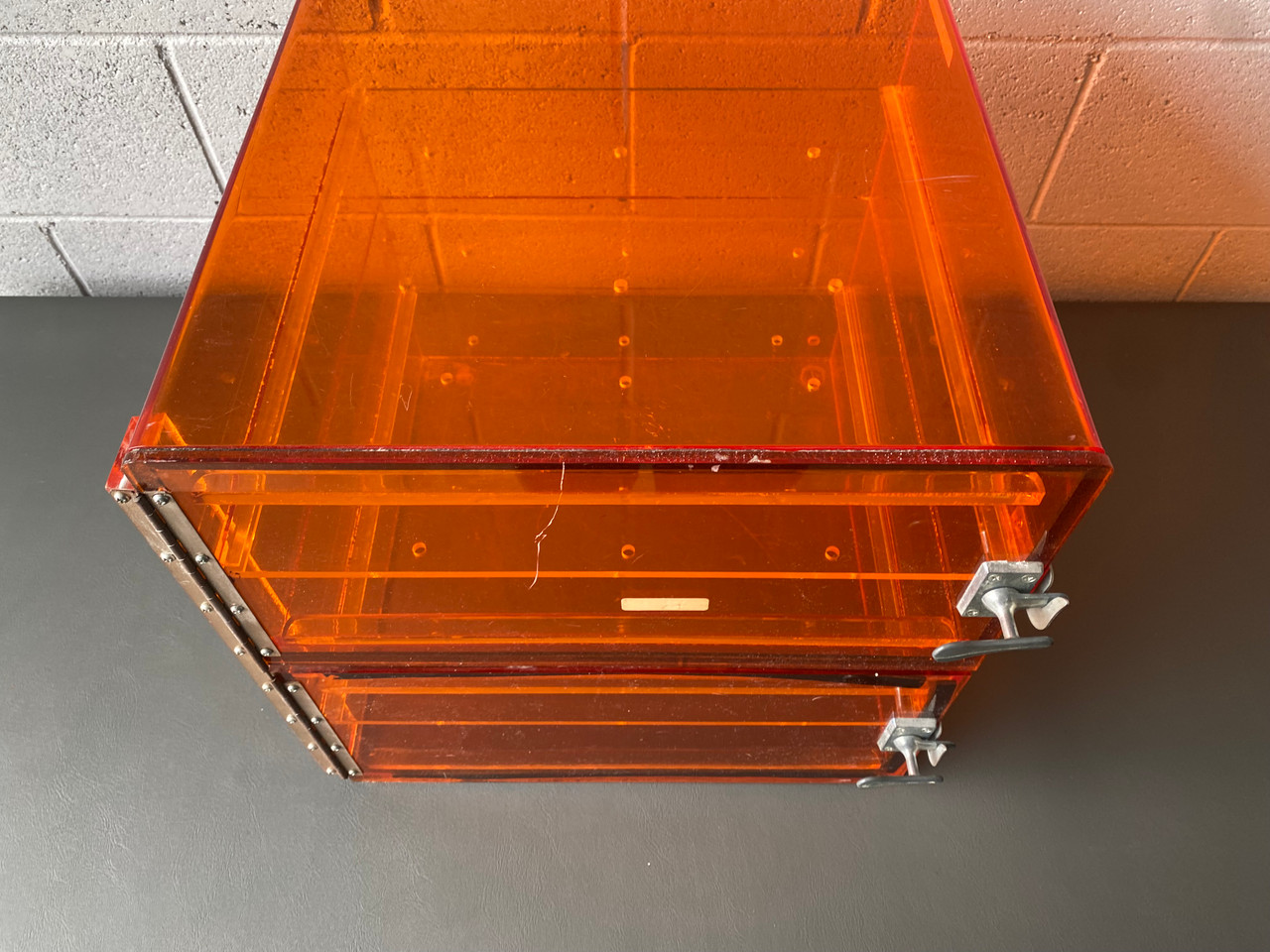 Rare mid-century Acrylic storage cabinet with 2 doors by Micro Air, Santa Clara CA. Removable / adjustable acrylic shelves. Great for the hobbyist or retailer.