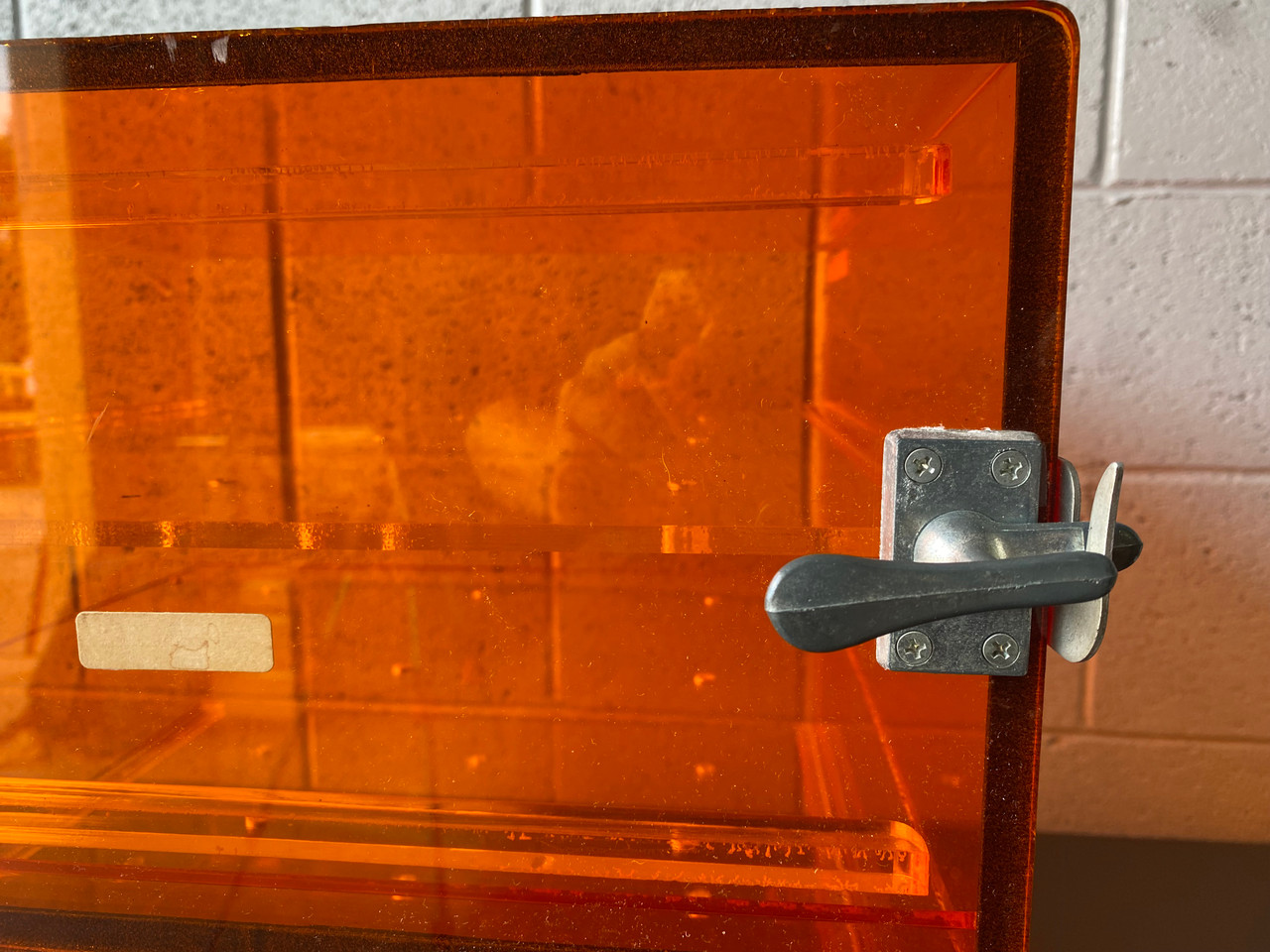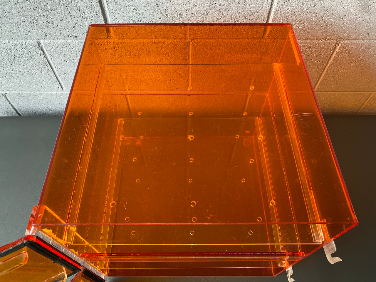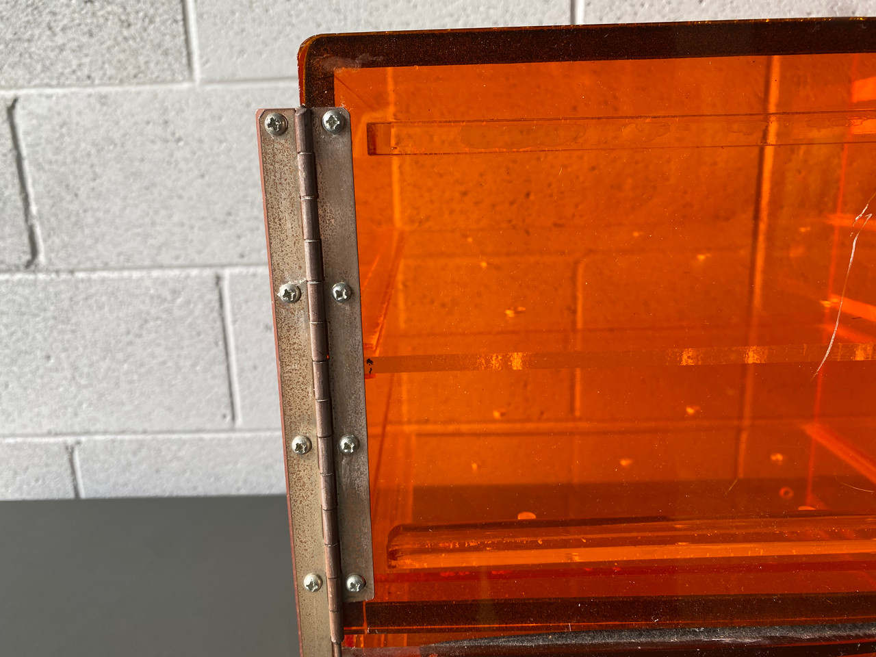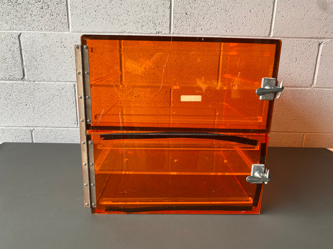 Rare mid-century Acrylic storage cabinet with 2 doors by Micro Air, Santa Clara CA. Removable / adjustable acrylic shelves. Great for the hobbyist or retailer.