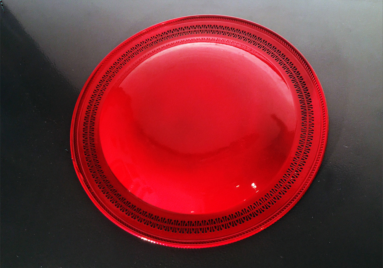 We took this this retro Reed & Barton display charger and gave it a pop of color. Refinished in a high gloss powder coat, this unique piece is sure to look fab your bar or vanity.