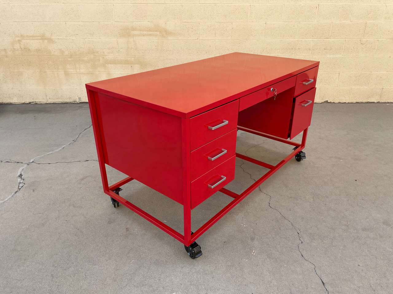 1970s Steelcase desk workbench conversion. Custom steel base & casters added for workroom or studio use. Ruby Red powder coat finish with metallic silver hardware.