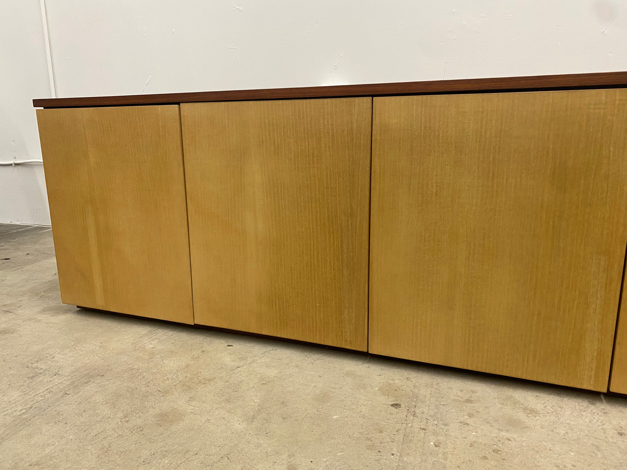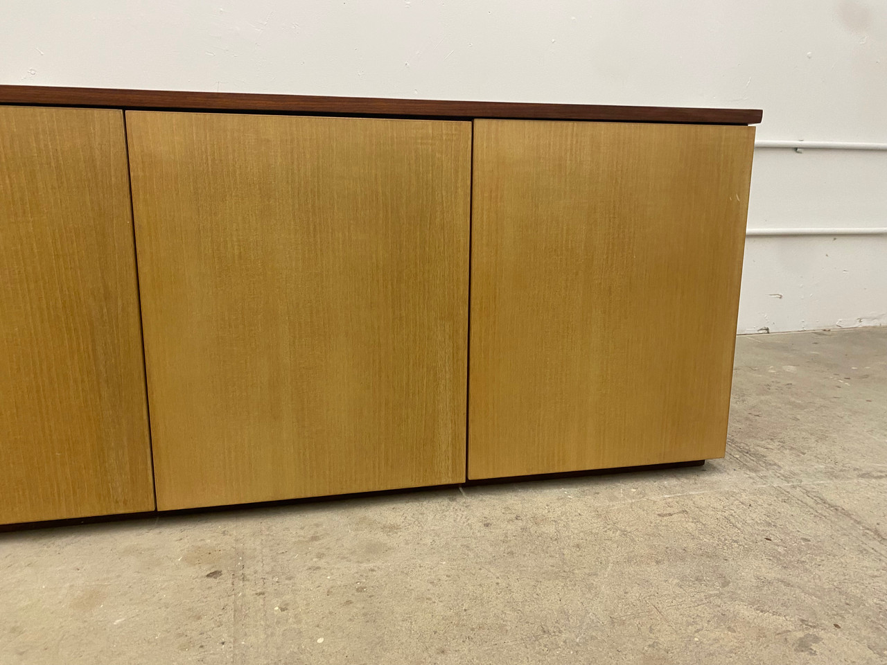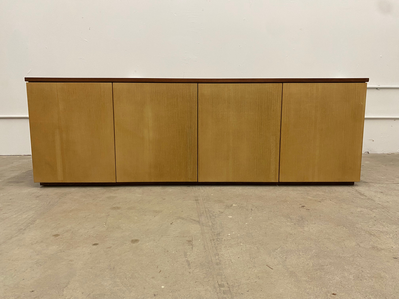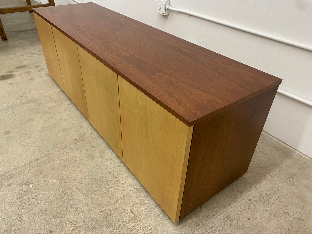 Gorgeous Mid century modern wood credenza with 4 doors and 8 compartments. Excellent choice for use as a media console or dresser. Ample storage space. With the two tone wood finish, this streamlined piece looks great from every angle.