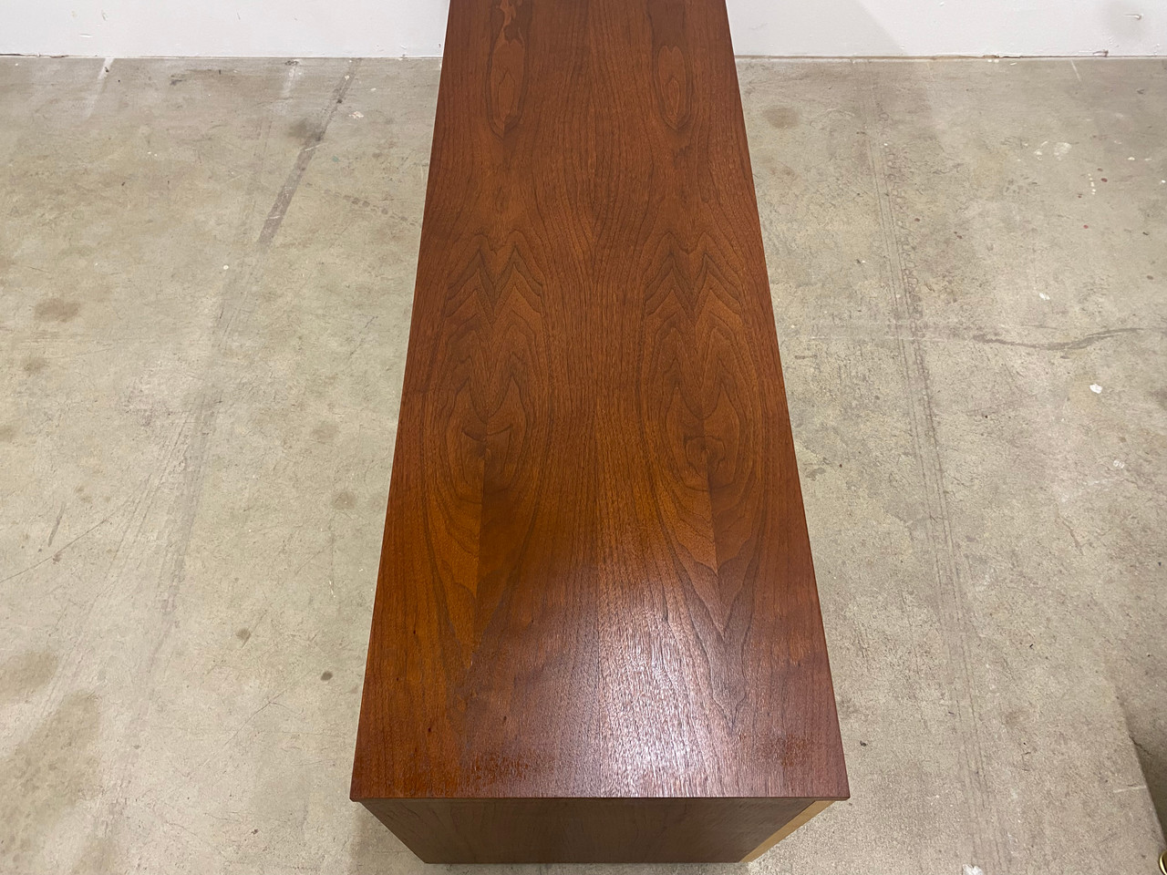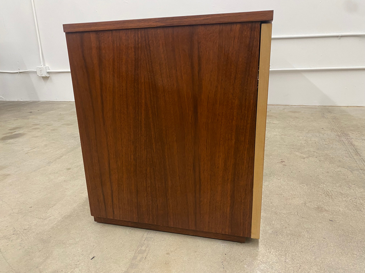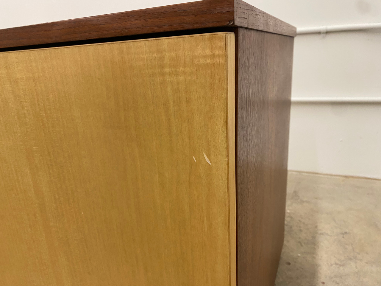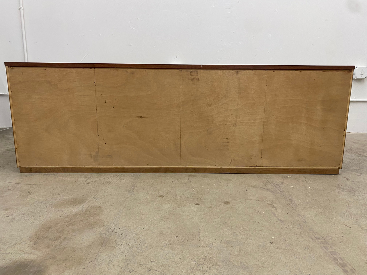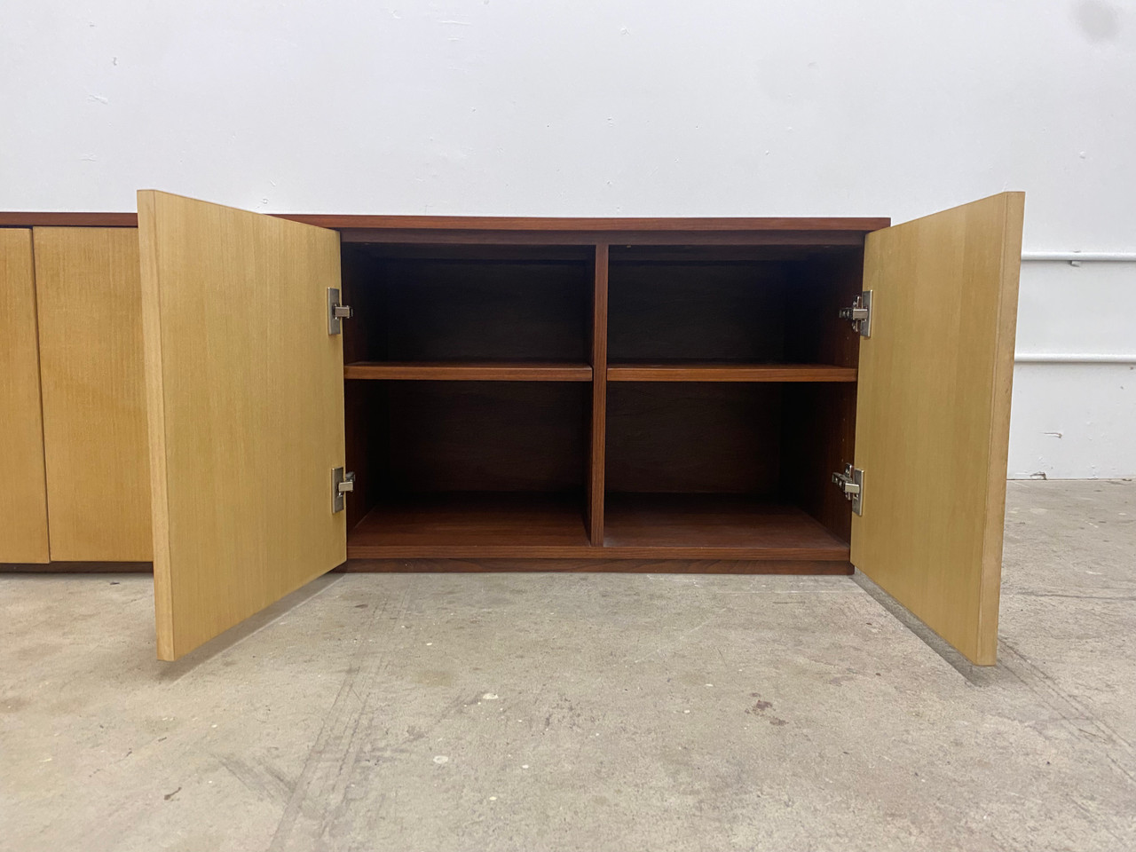 Gorgeous Mid century modern wood credenza with 4 doors and 8 compartments. Excellent choice for use as a media console or dresser. Ample storage space. With the two tone wood finish, this streamlined piece looks great from every angle.