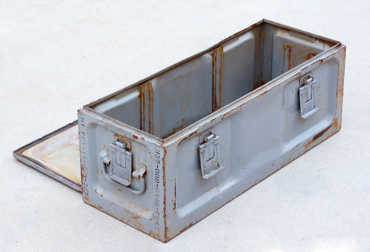Heavy duty steel case used for storage of explosive fuzes during WWII. Dated 1945 and 1978; it's believed to have been used again during the Vietnam war. This historical piece has a beautiful patina. Unlocks on all sides so top lifts off entirely. Put it to creative use for storage. Would look killer in a retail display or as a prop.