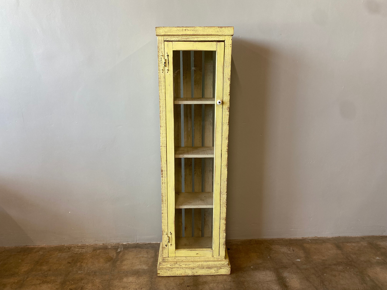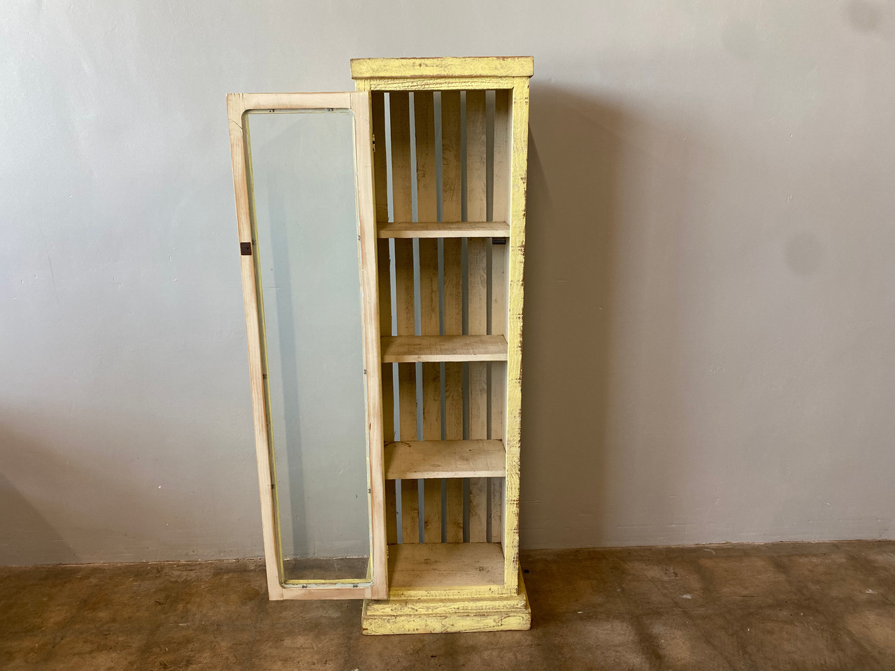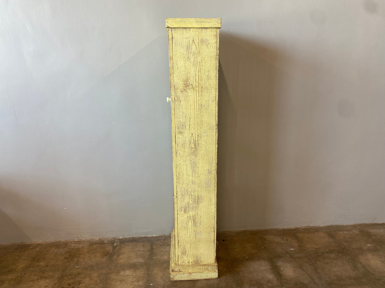Vintage tall narrow rectangular rustic cabinet. Features 4 shelves and full length glass door. Charming primitive construction and distressed yellow finish.