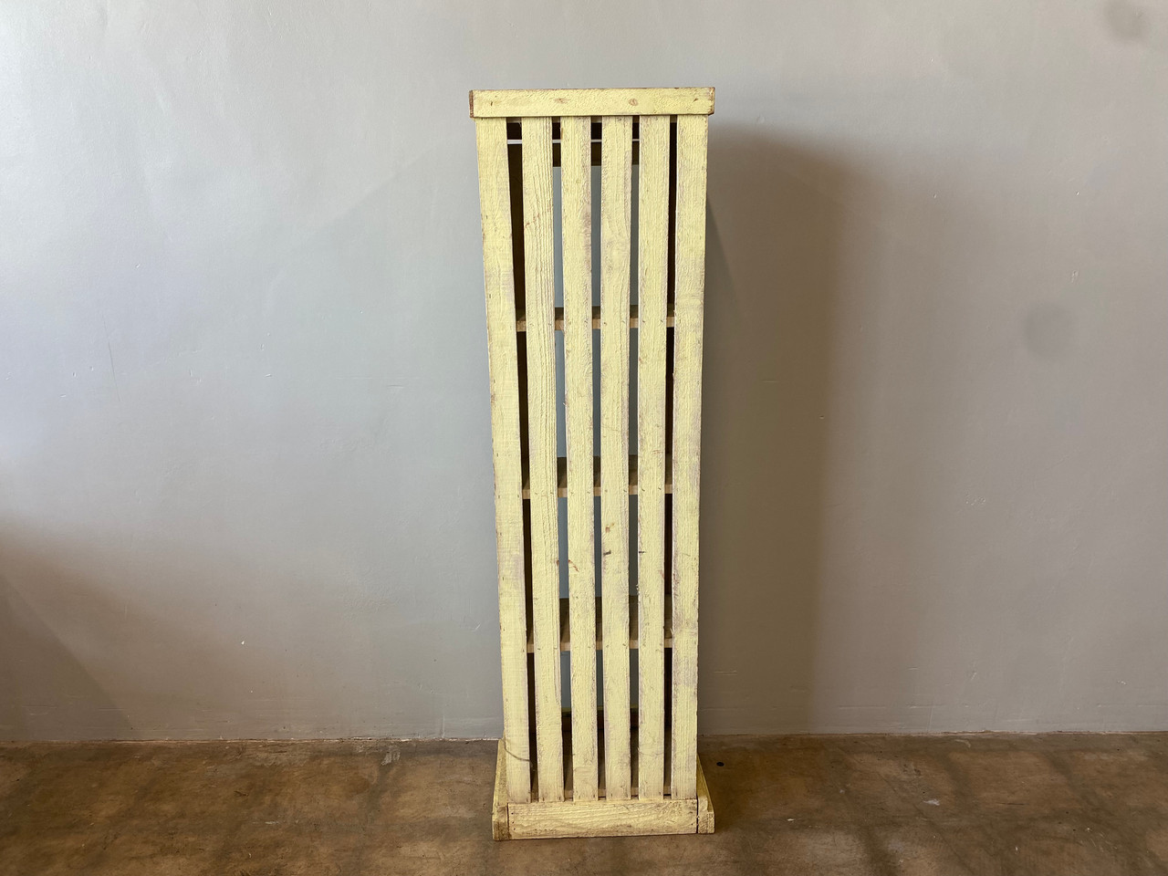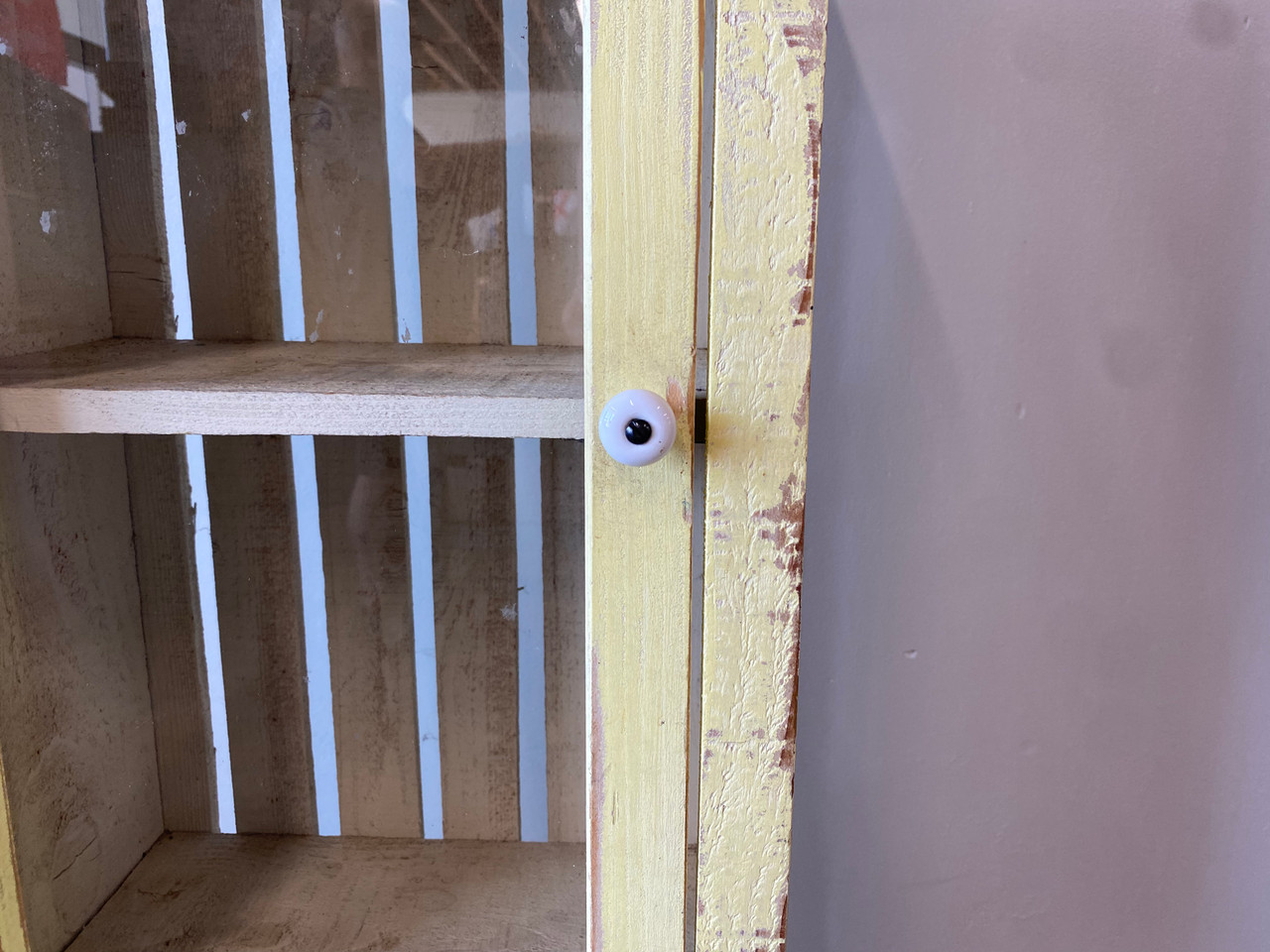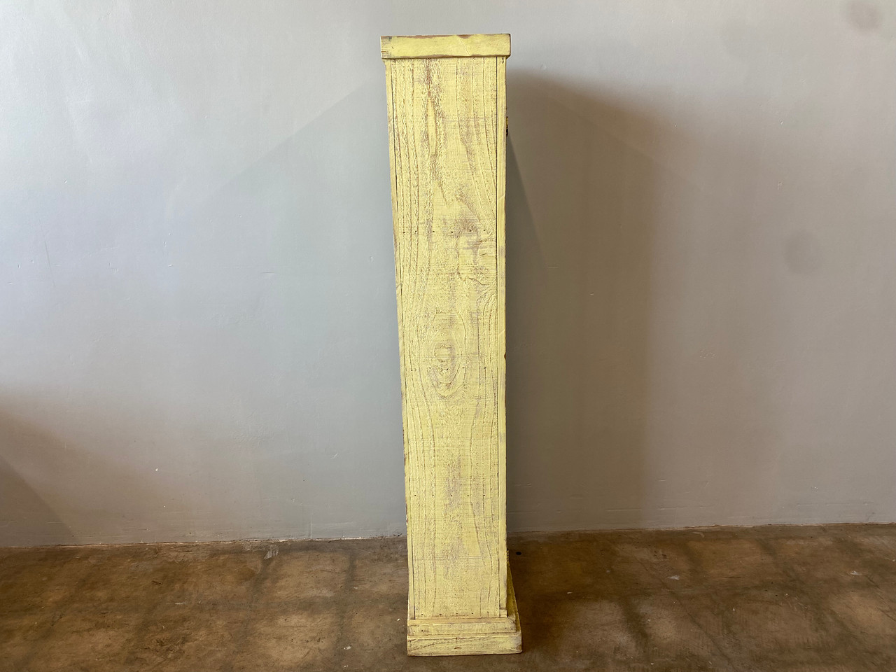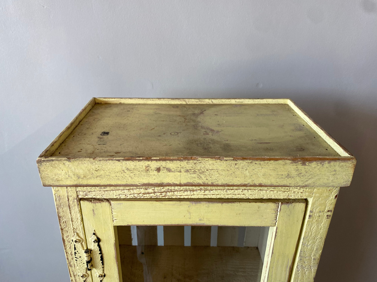 Vintage tall narrow rectangular rustic cabinet. Features 4 shelves and full length glass door. Charming primitive construction and distressed yellow finish.